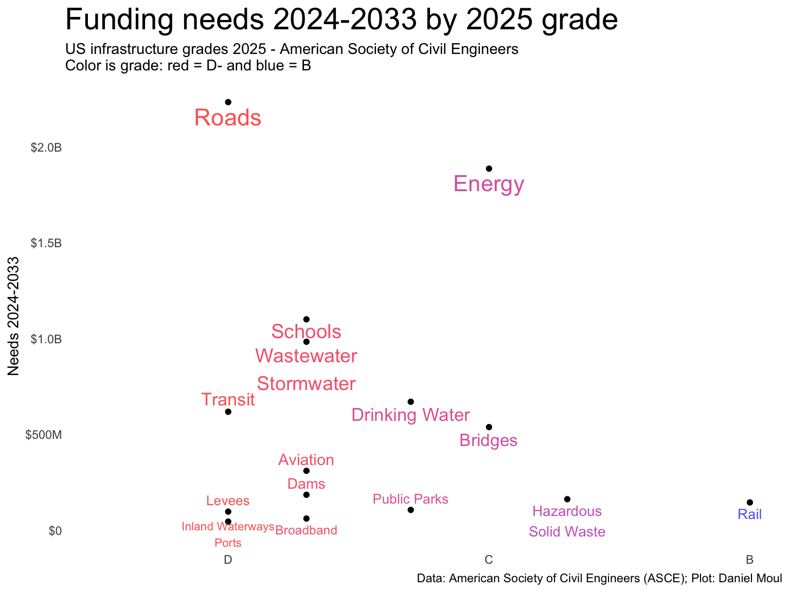 ###### Infrastructure investment needsd_investment_needs_raw <-read_csv(here("data/raw/cumulative_investment_needs_2025.csv")) |>clean_names()names(d_investment_needs_raw) <-str_remove(names(d_investment_needs_raw),"_billion_usd")d_investment_needs <- d_investment_needs_raw |>mutate(prop_of_need_funded = funded_2024_33 / needs,prop_of_funded_gap = funding_gap_2024_33 / needs )# Dams and levees are the most underfunded in terms of multiple of current funding (gap / funding)###### Infrastructure report card gradesd_grades <-read_csv(here("data/raw/infrastructure_grades_2025.csv")) |>clean_names() |>rows_append(tribble(~category,~grade,"Hazardous & Solid Waste","C+/C+","Inland Waterways & Ports","D/B","Wastewater + Stormwater","D+/D" ))d_infra_combined <-right_join( d_grades, d_investment_needs,by =join_by(category == infrastructure_system)) |>filter(category !="TOTAL") |>mutate(idx =row_number()) |>relocate(idx) %>%mutate(rank_funding_gap =nrow(.) -rank(funding_gap_2024_33) +1,rank_spending =nrow(.) -rank(funded_2024_33) +1,rank_needs =nrow(.) -rank(needs) +1,rank_prop_of_need_funded =nrow(.) -rank(prop_of_need_funded) +1 )