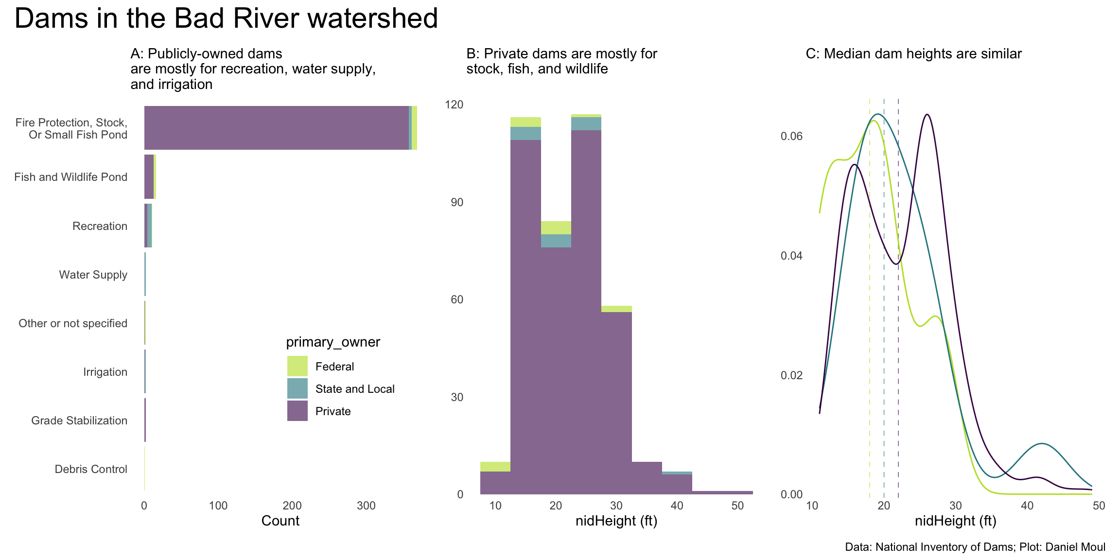 median_nidHeight_by_owner <- dams_in_bad_river_watershed |>st_drop_geometry() |>summarize(median_nidHeight =median(nidHeight, na.rm =TRUE),.by = primary_owner)p1 <- dams_in_bad_river_watershed |>count(primary_owner, primaryPurposeId) |>mutate(primaryPurposeId =fct_reorder(primaryPurposeId, n, sum)) |>ggplot(aes(n, primaryPurposeId, fill = primary_owner)) +geom_col() +scale_x_continuous(labels =label_number(scale_cut =cut_short_scale())) +scale_fill_viridis_d(end =0.90,direction =-1) +scale_color_viridis_d(end =0.90,direction =-1) +guides(fill =guide_legend(position ="inside")) +theme(legend.position.inside =c(0.7, 0.3)) +labs(subtitle =glue("A: Publicly-owned dams","\nare mostly for recreation, water supply,", "\nand irrigation"), x ="Count",y =NULL )p2 <- dams_in_bad_river_watershed |>ggplot(aes(nidHeight, fill = primary_owner)) +geom_histogram(binwidth =5,alpha =0.6) +scale_x_continuous(labels =label_number(scale_cut =cut_short_scale())) +scale_y_continuous(expand =expansion(mult =c(0.01, 0.04))) +scale_fill_viridis_d(end =0.90,direction =-1) +scale_color_viridis_d(end =0.90,direction =-1) +guides(color ="none",fill ="none") +labs(subtitle =glue("B: Private dams are mostly for", "\nstock, fish, and wildlife"),x ="nidHeight (ft)",y =NULL )p3 <- dams_in_bad_river_watershed |>ggplot(aes(nidHeight, color = primary_owner)) +geom_vline(data = median_nidHeight_by_owner,aes(xintercept = median_nidHeight, color = primary_owner),lty =2,linewidth =0.25,alpha =0.75) +geom_density() +scale_x_continuous(labels =label_number(scale_cut =cut_short_scale())) +scale_y_continuous(expand =expansion(mult =c(0.01, 0.04))) +scale_color_viridis_d(end =0.90,direction =-1) +guides(color ="none",fill ="none") +labs(subtitle =glue("C: Median dam heights are similar"),x ="nidHeight (ft)",y =NULL )p1 + p2 + p3 +plot_annotation(title ="Dams in the Bad River watershed",caption = my_caption )
