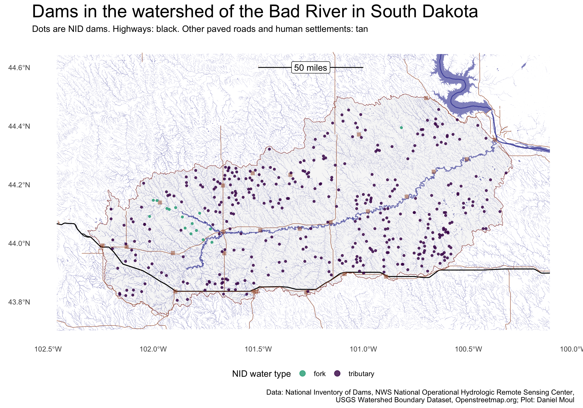 dams_in_bad_river_watershed |>ggplot() +geom_sf(data = bad_river_watershed |>st_union() |>st_crop(dams_in_buffer_bbox),color =muted("firebrick"),linewidth =0.2,alpha =0.3) +geom_sf(data = sd_NHDFlowLine, # many small streamscolor ="darkblue",# "grey60",linewidth =0.05,alpha =0.3) +geom_sf(data = sd_bad_river, # the main river# size = 0.01,linewidth =0.5,color ="darkblue", # "grey70",alpha =0.5) +geom_sf(data = sd_NHDFlowLine_missouri_river, # the bigger river that Bad River flows into# size = 0.01,# linewidth = 0.5,color ="darkblue", # "grey70",alpha =0.5) +geom_sf(data = sd_NHDWaterbody, # the lake just upriver from where Bad River enters the Missouri# size = 0.01,linewidth =1,color =NA, #"darkblue", # "grey70",fill ="darkblue",alpha =0.5) +# roadsgeom_sf(data = sd_bad_river_roads |># roads in the buffer bboxfilter(highway =="motorway") |>st_crop(st_union(sd_NHDWaterbody)),linewidth =0.5,color ="black", #"darkblue", # "grey70",fill =NA,alpha =0.9) +geom_sf(data = sd_bad_river_roads |># roads in the buffer bboxfilter(highway %in%c("primary", "secondary") | highway =="tertiary"& surface %in%c("paved", "asphalt", "concrete") ) |>st_crop(st_union(sd_NHDWaterbody)),linewidth =0.25,color ="sienna", fill =NA,alpha =0.9) +# placesgeom_sf(data = sd_bad_river_places |># places in the buffer bboxfilter(!is.na(place)) |>st_join(st_as_sf(st_union(bad_river_watershed)), join = st_within, left =FALSE),size =2, # was 0.15color ="sienna", # fill = "gold",shape =15, # solid square alpha =0.5) +geom_sf(aes(color = water_type),size =1, # The NID dataset pointsalpha =0.8 ) +geom_sf(data = distance_bar) +# distance bar linegeom_sf_label(data = distance_bar,aes(label = name)) +# distance bar labelscale_color_viridis_d(end =0.60,direction =-1) +guides(color =guide_legend(override.aes =list(size =3))) +theme(legend.position ="bottom") +labs(title ="Dams in the watershed of the Bad River in South Dakota",subtitle =glue("Dots are NID dams. Highways: black. Other paved roads and human settlements: tan"),x =NULL,y =NULL,color ="NID water type",caption = my_caption_nid_nws_wbd_oms )