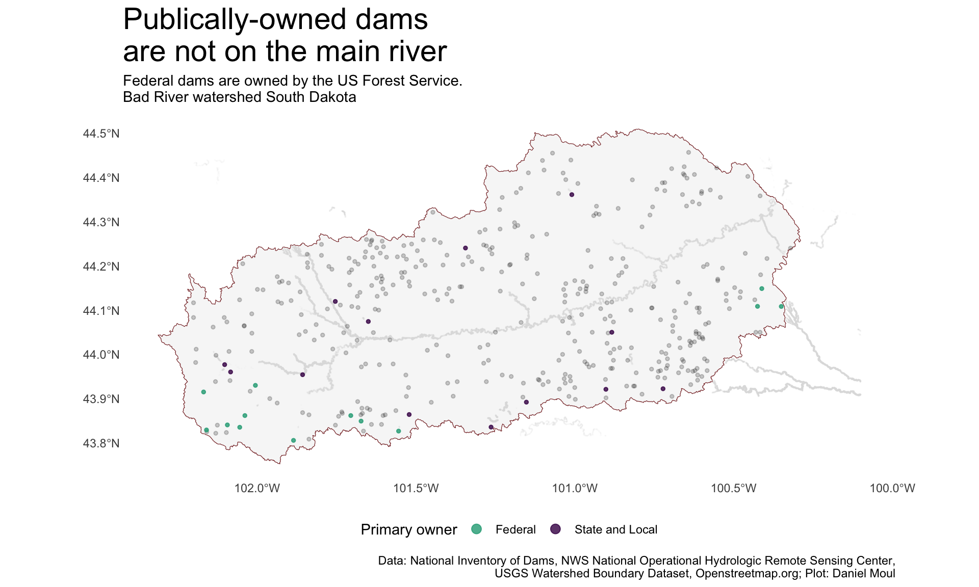 ggplot() +geom_sf(data = bad_river_watershed |>st_union() |>st_crop(dams_in_buffer_bbox),color =muted("firebrick"),linewidth =0.2,alpha =0.3) +geom_sf(data = sd_bad_river_points |>st_crop(dams_in_buffer_bbox), size =0.005,color ="grey90",alpha =0.05) +geom_sf(data = sd_bad_river,size =0.005,color ="grey70",alpha =0.05) +# was 0.3geom_sf(data = dams_in_bad_river_watershed |>filter(primary_owner =="Private"), size =1,alpha =0.2 ) +geom_sf(data = dams_in_bad_river_watershed |>filter(primary_owner !="Private"), aes(color = primary_owner),size =1,alpha =0.8 ) +scale_color_viridis_d(end =0.6,direction =-1) +guides(color =guide_legend(override.aes =list(size =3))) +theme(legend.position ="bottom") +labs(title ="Publically-owned dams\nare not on the main river",subtitle =glue("Federal dams are owned by the US Forest Service.\nBad River watershed South Dakota"),color ="Primary owner",caption = my_caption_nid_nws_wbd_oms )