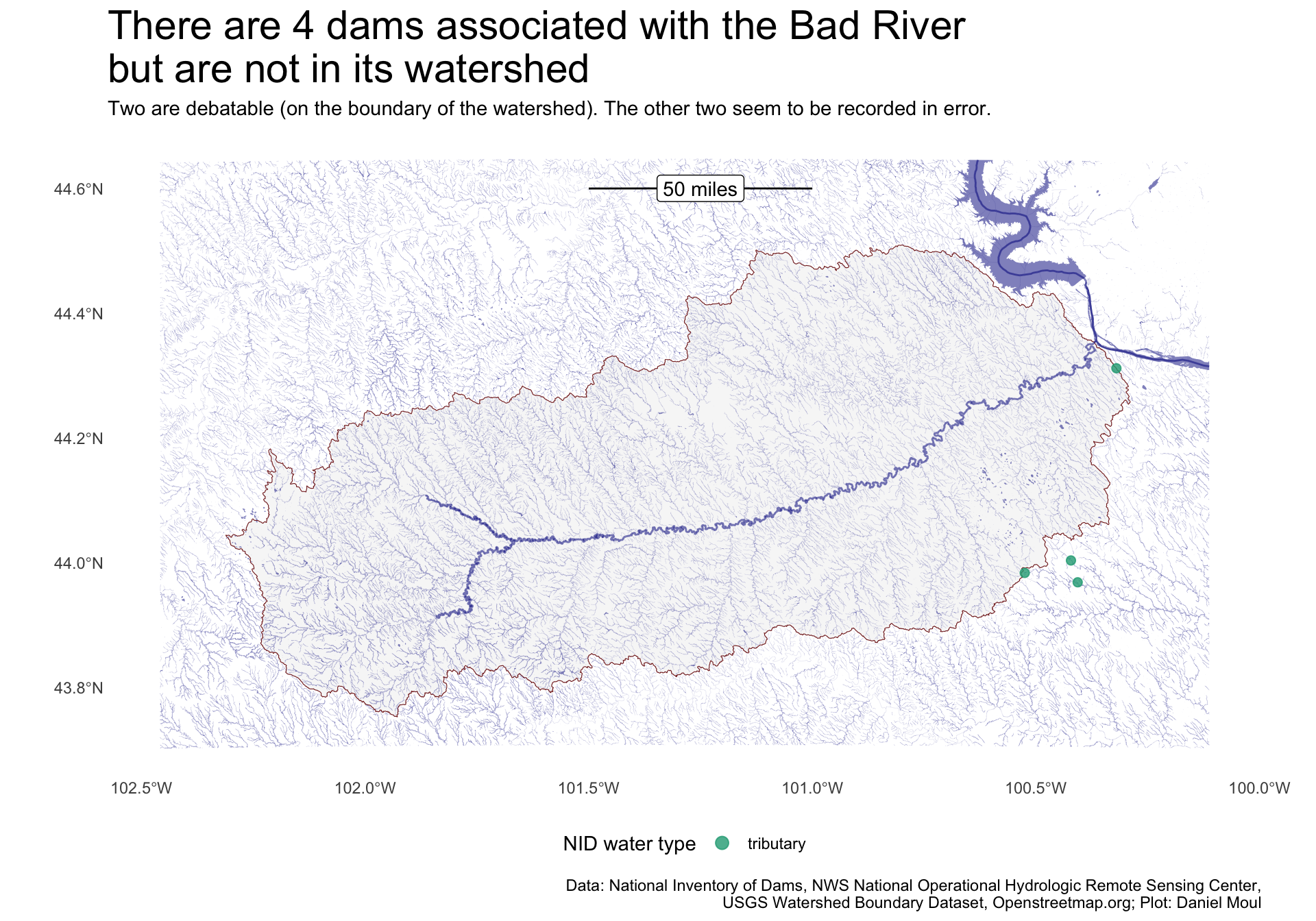 ## Not in the watersheddta_for_plot <- dams_in_buffer_around_bad_river_watershed |>filter(water_name_root =="bad river")n_dams_in_error <-nrow(dta_for_plot)dta_for_plot |>ggplot() +geom_sf(data = bad_river_watershed |>st_union() |>st_crop(dams_in_buffer_bbox),color =muted("firebrick"),linewidth =0.2,alpha =0.3) +geom_sf(data = sd_NHDFlowLine, # many small streamscolor ="darkblue",# "grey60",linewidth =0.05,alpha =0.3) +geom_sf(data = sd_bad_river, # the main river# size = 0.01,linewidth =0.5,color ="darkblue", # "grey70",alpha =0.5) +geom_sf(data = sd_NHDFlowLine_missouri_river, # the bigger river that Bad River flows into# size = 0.01,linewidth =0.5,color ="darkblue", # "grey70",alpha =0.5) +geom_sf(data = sd_NHDWaterbody, # the lake just upriver from where Bad River enters the Missouri# size = 0.01,linewidth =1,color =NA, #"darkblue", # "grey70",fill ="darkblue",alpha =0.5) +geom_sf(aes(color = water_type),size =2, # The NID dataset pointsalpha =0.8 ) +geom_sf(data = distance_bar) +# distance bar linegeom_sf_label(data = distance_bar,aes(label = name)) +# distance bar labelscale_color_viridis_d(end =0.60,direction =-1) +guides(color =guide_legend(override.aes =list(size =3))) +theme(legend.position ="bottom") +labs(title =glue("There are {n_dams_in_error} dams associated with the Bad River\nbut are not in its watershed"),subtitle ="Two are debatable (on the boundary of the watershed). The other two seem to be recorded in error.",x =NULL,y =NULL,color ="NID water type",caption = my_caption_nid_nws_wbd_oms )