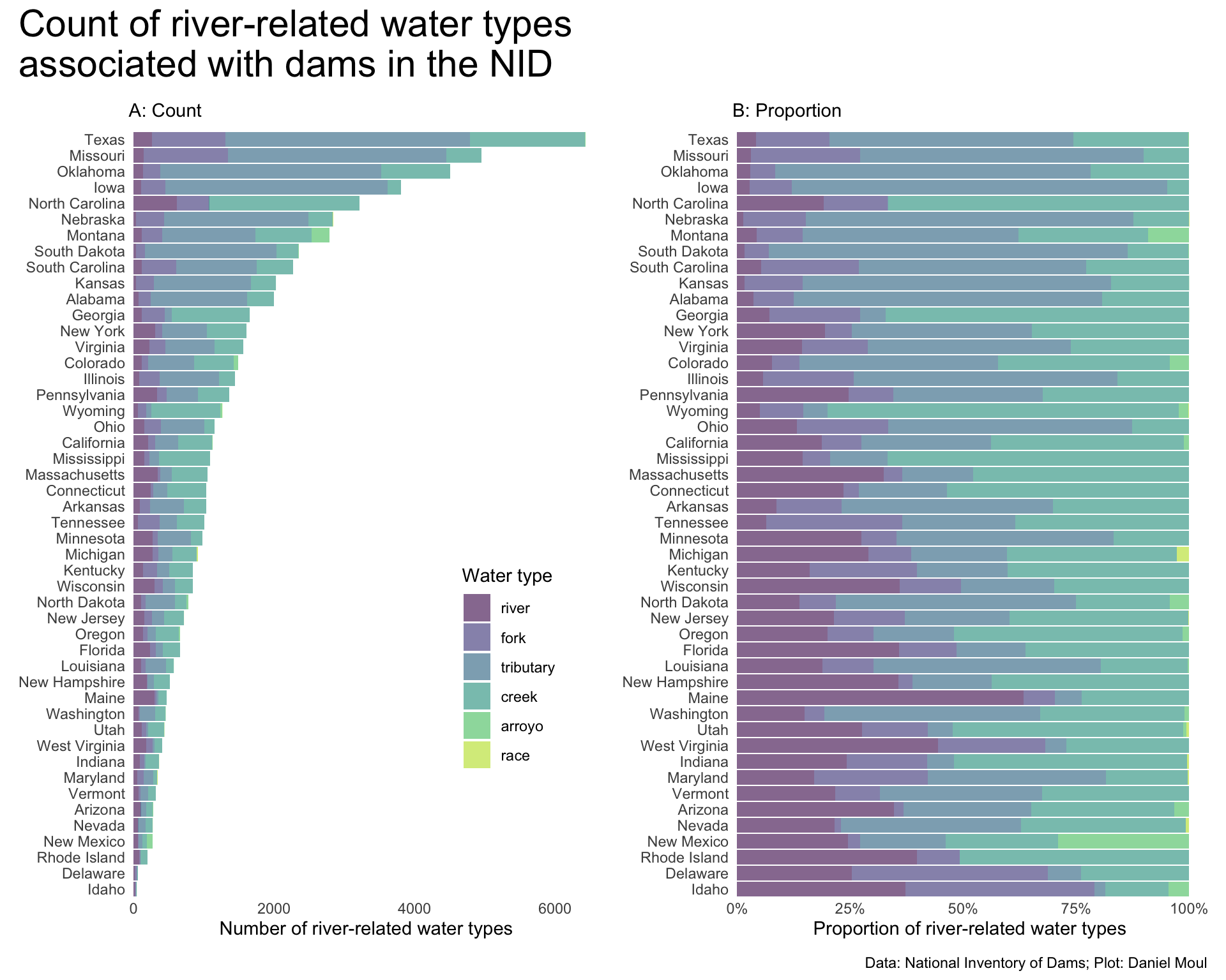 dta_for_plot <- dams_and_rivers_count_by_state_simplified |>mutate(state =fct_reorder(state, n, sum),water_type =factor(water_type, levels =rev(c("river", "fork", "tributary", "creek", "arroyo", "race"))) )p1 <- dta_for_plot |>ggplot() +geom_col(aes(n, state, fill = water_type)) +scale_x_continuous(expand =expansion(mult =c(0.01, 0.04))) +scale_fill_viridis_d(end =0.9,direction =-1) +guides(fill =guide_legend(position ="inside",reverse =TRUE)) +theme(legend.position.inside =c(0.8, 0.3)) +labs(subtitle ="A: Count",x ="Number of river-related water types",y =NULL,fill ="Water type" )p2 <- dta_for_plot |>ggplot() +geom_col(aes(n, state, fill = water_type),position ="fill",show.legend =FALSE) +scale_x_continuous(expand =expansion(mult =c(0.01, 0.04)),labels =label_percent()) +scale_fill_viridis_d(end =0.9,direction =-1) +labs(subtitle ="B: Proportion",x ="Proportion of river-related water types",y =NULL,fill ="Water type" )p1 + p2 +plot_annotation(title ="Count of river-related water types\nassociated with dams in the NID",caption = my_caption, )