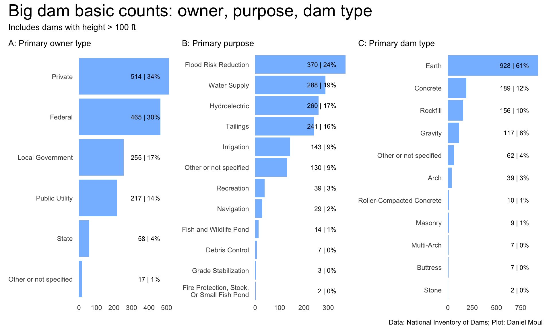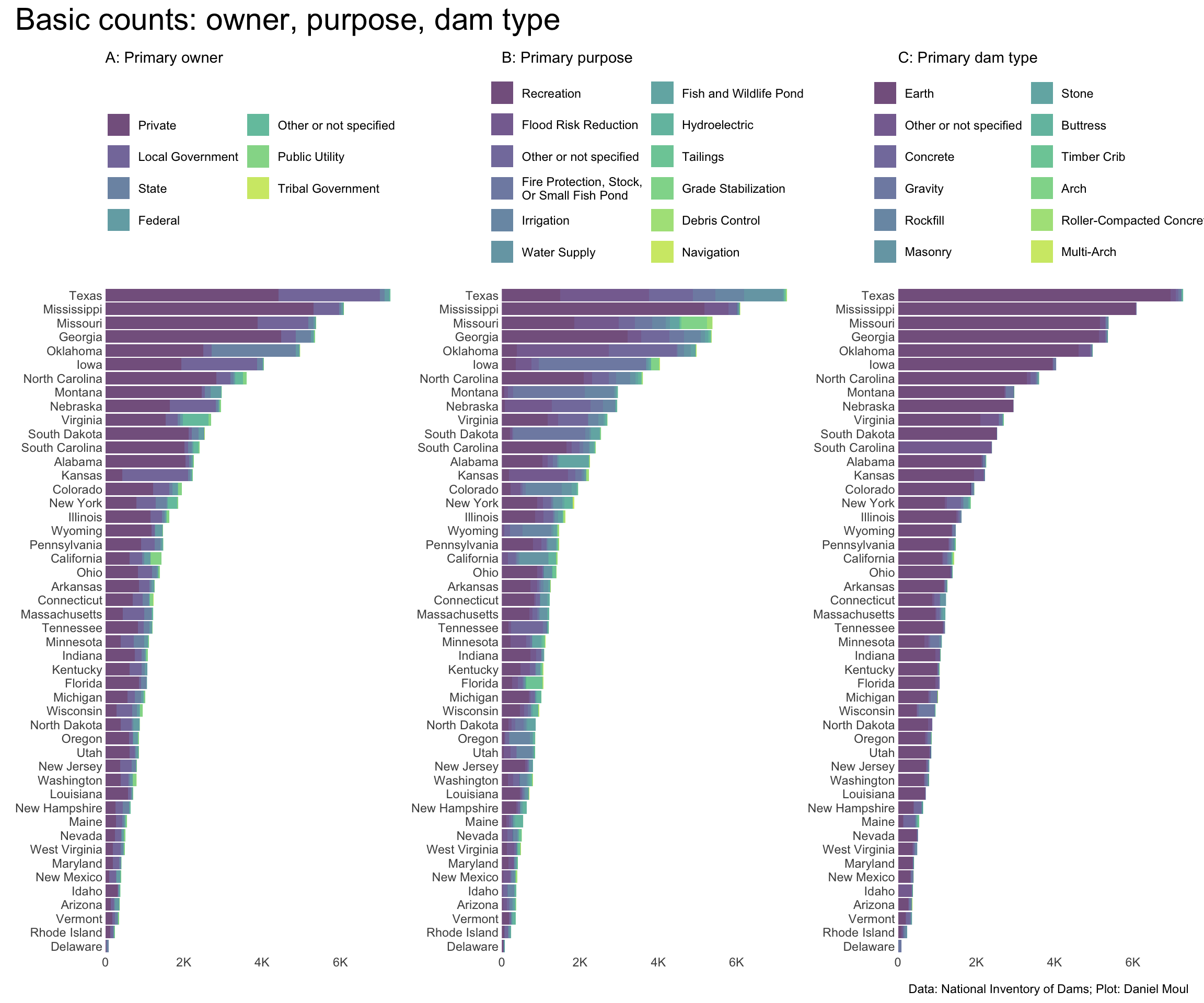 p1 <- dams_no_geo |>count(state, primaryOwnerTypeId) |>mutate(state =fct_reorder(state, n, sum),primaryOwnerTypeId =fct_reorder(primaryOwnerTypeId, n, sum)) |>ggplot() +geom_col(aes(x = n, y = state, fill = primaryOwnerTypeId),alpha =0.7) +scale_x_continuous(labels =label_number(scale_cut =cut_short_scale()),expand =expansion(mult =c(0, 0.02))) +scale_fill_viridis_d(end =0.9,direction =-1) +guides(fill =guide_legend(reverse =TRUE,ncol =2)) +theme(legend.position ="top")+labs(subtitle ="A: Primary owner",x =NULL,y =NULL,fill =NULL )p2 <- dams_no_geo |>count(state, primaryPurposeId) |>mutate(state =fct_reorder(state, n, sum),primaryPurposeId =fct_reorder(primaryPurposeId, n, sum)) |>ggplot() +geom_col(aes(x = n, y = state, fill = primaryPurposeId),alpha =0.7) +scale_x_continuous(labels =label_number(scale_cut =cut_short_scale()),expand =expansion(mult =c(0, 0.02))) +scale_fill_viridis_d(end =0.9,direction =-1) +guides(fill =guide_legend(reverse =TRUE,ncol =2)) +theme(legend.position ="top")+labs(subtitle ="B: Primary purpose",x =NULL,y =NULL,fill =NULL )p3 <- dams_no_geo |>count(state, primaryDamTypeId) |>mutate(state =fct_reorder(state, n, sum),primaryDamTypeId =fct_reorder(primaryDamTypeId, n, sum)) |>ggplot() +geom_col(aes(x = n, y = state, fill = primaryDamTypeId),alpha =0.7) +scale_x_continuous(labels =label_number(scale_cut =cut_short_scale()),expand =expansion(mult =c(0, 0.02))) +scale_fill_viridis_d(end =0.9,direction =-1) +guides(fill =guide_legend(reverse =TRUE,ncol =2)) +theme(legend.position ="top") +labs(subtitle ="C: Primary dam type",x =NULL,y =NULL,fill =NULL )p1 + p2 + p3 +plot_annotation(title ="Basic counts: owner, purpose, dam type",caption = my_caption )