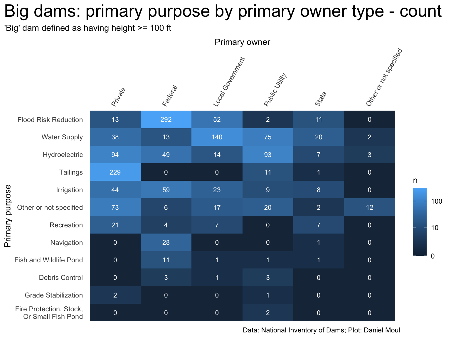 owner_purpose_big <- dams_no_geo |>filter(big_dam) |># only "big" damscount(primaryOwnerTypeId, primaryPurposeId) |>complete(primaryOwnerTypeId, primaryPurposeId, fill =list(n =0)) |>mutate(primaryOwnerTypeId =fct_reorder(primaryOwnerTypeId, -n, sum),primaryPurposeId =fct_reorder(primaryPurposeId, n, sum))owner_purpose_big |>ggplot(aes(x = primaryOwnerTypeId, y = primaryPurposeId)) +geom_tile(aes(fill = n),alpha =0.98) +geom_text(aes(label = n),color ="white",size =3) +theme(plot.title.position ="plot",axis.text.x =element_text(angle =60, hjust =0) ) +scale_x_discrete(position ="top") +scale_fill_continuous(transform = scales::transform_log1p(),breaks =c(0, 10, 100, 1000, 10000)) +labs(title ="Big dams: primary purpose by primary owner type - count",subtitle ="'Big' dam defined as having height >= 100 ft",x ="Primary owner",y ="Primary purpose",caption = my_caption )