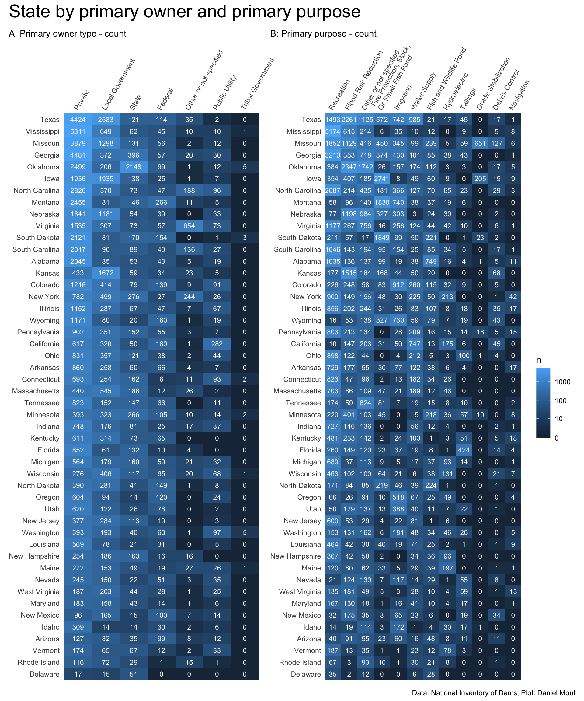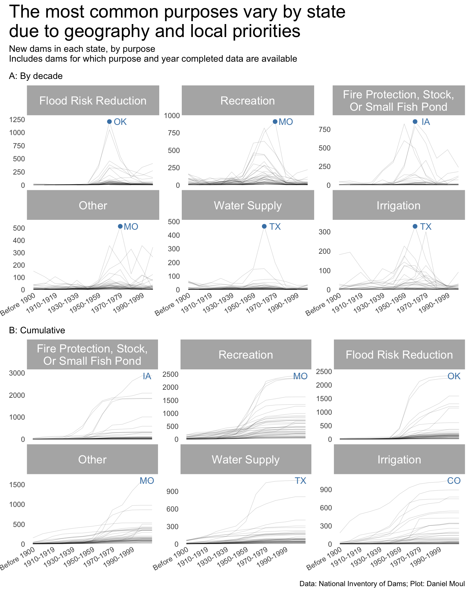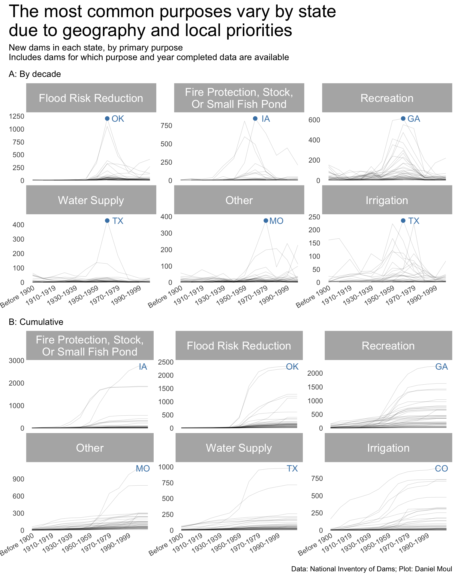 year_build_by_primary_purpose <- dams_no_geo |>left_join(dams_no_geo_all_purposes |>select(nidId, purpose_id),by =join_by(nidId)) |>filter(yearCompletedId !="Undetermined", primaryPurposeId !="Other or not specified") |>select(nidId, primaryOwnerTypeId, primaryPurposeId, purpose_id, state, state_abb, state_region, nidStorage, yearCompleted, yearCompletedId) |>mutate(yearCompletedId =factor(yearCompletedId, levels = yearCompletedId_levels, ordered =TRUE)) |>mutate(purpose_id =fct_lump_n(purpose_id, n =5)) |>count(yearCompletedId, purpose_id, state_region, state_abb) |>mutate(purpose_id =fct_reorder(purpose_id, -n, min))dta_highlight <- year_build_by_primary_purpose |>slice_max(order_by = n, n =1,by =c(purpose_id))p1 <- year_build_by_primary_purpose |>ggplot() +geom_line(aes(yearCompletedId, n, group = state_abb),linewidth =0.2,alpha =0.2) +geom_point(data = dta_highlight,aes(yearCompletedId, n, ),size =2,color ="steelblue",show.legend =FALSE) +geom_text(data = dta_highlight,aes(yearCompletedId, n, label = state_abb),nudge_x =1,color ="steelblue",show.legend =FALSE) +scale_x_discrete(breaks = yearCompletedId_breaks) +scale_y_continuous(expand =expansion(mult =c(0.01, 0.1))) +guides(color =guide_legend(override.aes =list(linewidth =3))) +expand_limits(y =0) +facet_wrap(~purpose_id, scales ="free_y") +theme(plot.title.position ="plot",legend.position ="top",axis.text.x =element_text(angle =30, hjust =1) ) +labs(subtitle ="A: By decade",x =NULL,y =NULL )year_build_by_primary_purpose <- dams_no_geo |>left_join(dams_no_geo_all_purposes |>select(nidId, purpose_id),by =join_by(nidId)) |>filter(yearCompletedId !="Undetermined", primaryPurposeId !="Other or not specified") |>select(nidId, primaryOwnerTypeId, primaryPurposeId, purpose_id, state, state_abb, state_region, nidStorage, yearCompleted, yearCompletedId) |>mutate(yearCompletedId =factor(yearCompletedId, levels = yearCompletedId_levels, ordered =TRUE)) |>mutate(purpose_id =fct_lump_n(purpose_id, n =5)) |>count(yearCompletedId, purpose_id, state_abb) |>complete(yearCompletedId, purpose_id, state_abb,fill =list(n =0)) |>mutate(n_cum =cumsum(n),idx =row_number(),.by =c(purpose_id, state_abb)) |>mutate(purpose_id =fct_reorder(purpose_id, -n_cum, min))dta_highlight <- year_build_by_primary_purpose |>filter(yearCompletedId !="Undetermined", yearCompletedId =="Since 2000") |>slice_max(order_by = n_cum, n =1,by = purpose_id)p2 <- year_build_by_primary_purpose |>ggplot() +geom_line(aes(yearCompletedId, n_cum, group = state_abb),linewidth =0.2,alpha =0.2) +geom_text(data = dta_highlight,aes(yearCompletedId, n_cum, label = state_abb),nudge_x =0.5,color ="steelblue",show.legend =FALSE) +scale_x_discrete(breaks = yearCompletedId_breaks) +scale_y_continuous(expand =expansion(mult =c(0.01, 0.1))) +guides(color =guide_legend(override.aes =list(linewidth =3))) +expand_limits(y =0) +facet_wrap(~purpose_id, scales ="free_y") +theme(plot.title.position ="plot",legend.position ="top",axis.text.x =element_text(angle =30, hjust =1) ) +labs(subtitle ="B: Cumulative",x =NULL,y =NULL )p1 / p2 +plot_annotation(title ="The most common purposes vary by state\ndue to geography and local priorities",subtitle =glue("New dams in each state, by purpose","\nIncludes dams for which purpose and year completed data are available"),caption = my_caption )