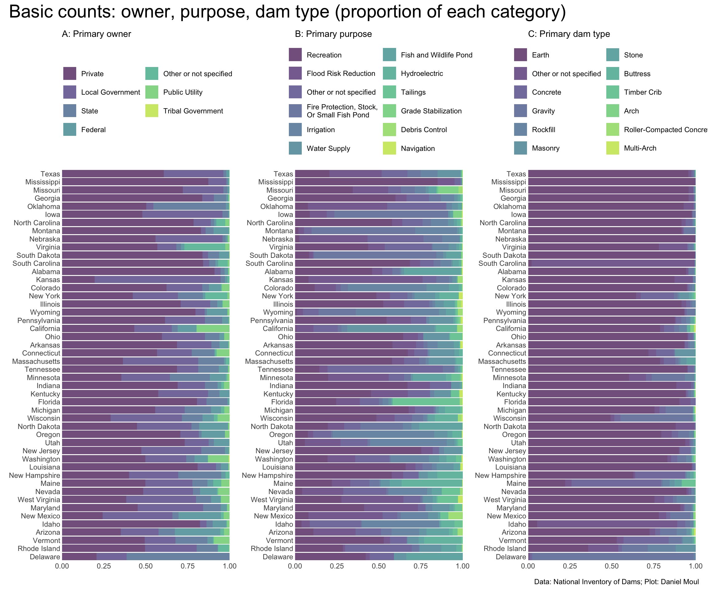 p1 <- dams_no_geo |>count(state, primaryOwnerTypeId) |>mutate(state =fct_reorder(state, n, sum),primaryOwnerTypeId =fct_reorder(primaryOwnerTypeId, n, sum)) |>ggplot() +geom_col(aes(x = n, y = state, fill = primaryOwnerTypeId),position ="fill",alpha =0.7) +scale_x_continuous(labels =label_number(scale_cut =cut_short_scale()),expand =expansion(mult =c(0, 0.02))) +scale_fill_viridis_d(end =0.9,direction =-1) +guides(fill =guide_legend(reverse =TRUE,ncol =2)) +theme(legend.position ="top")+labs(subtitle ="A: Primary owner",x =NULL,y =NULL,fill =NULL )p2 <- dams_no_geo |>count(state, primaryPurposeId) |>mutate(state =fct_reorder(state, n, sum),primaryPurposeId =fct_reorder(primaryPurposeId, n, sum)) |>ggplot() +geom_col(aes(x = n, y = state, fill = primaryPurposeId),position ="fill",alpha =0.7) +scale_x_continuous(labels =label_number(scale_cut =cut_short_scale()),expand =expansion(mult =c(0, 0.02))) +scale_fill_viridis_d(end =0.9,direction =-1) +guides(fill =guide_legend(reverse =TRUE,ncol =2)) +theme(legend.position ="top")+labs(subtitle ="B: Primary purpose",x =NULL,y =NULL,fill =NULL )p3 <- dams_no_geo |>count(state, primaryDamTypeId) |>mutate(state =fct_reorder(state, n, sum),primaryDamTypeId =fct_reorder(primaryDamTypeId, n, sum)) |>ggplot() +geom_col(aes(x = n, y = state, fill = primaryDamTypeId),position ="fill",alpha =0.7) +scale_x_continuous(labels =label_number(scale_cut =cut_short_scale()),expand =expansion(mult =c(0, 0.02))) +scale_fill_viridis_d(end =0.9,direction =-1) +guides(fill =guide_legend(reverse =TRUE,ncol =2)) +theme(legend.position ="top")+labs(subtitle ="C: Primary dam type",x =NULL,y =NULL,fill =NULL )p1 + p2 + p3 +plot_annotation(title ="Basic counts: owner, purpose, dam type (proportion of each category)",caption = my_caption )