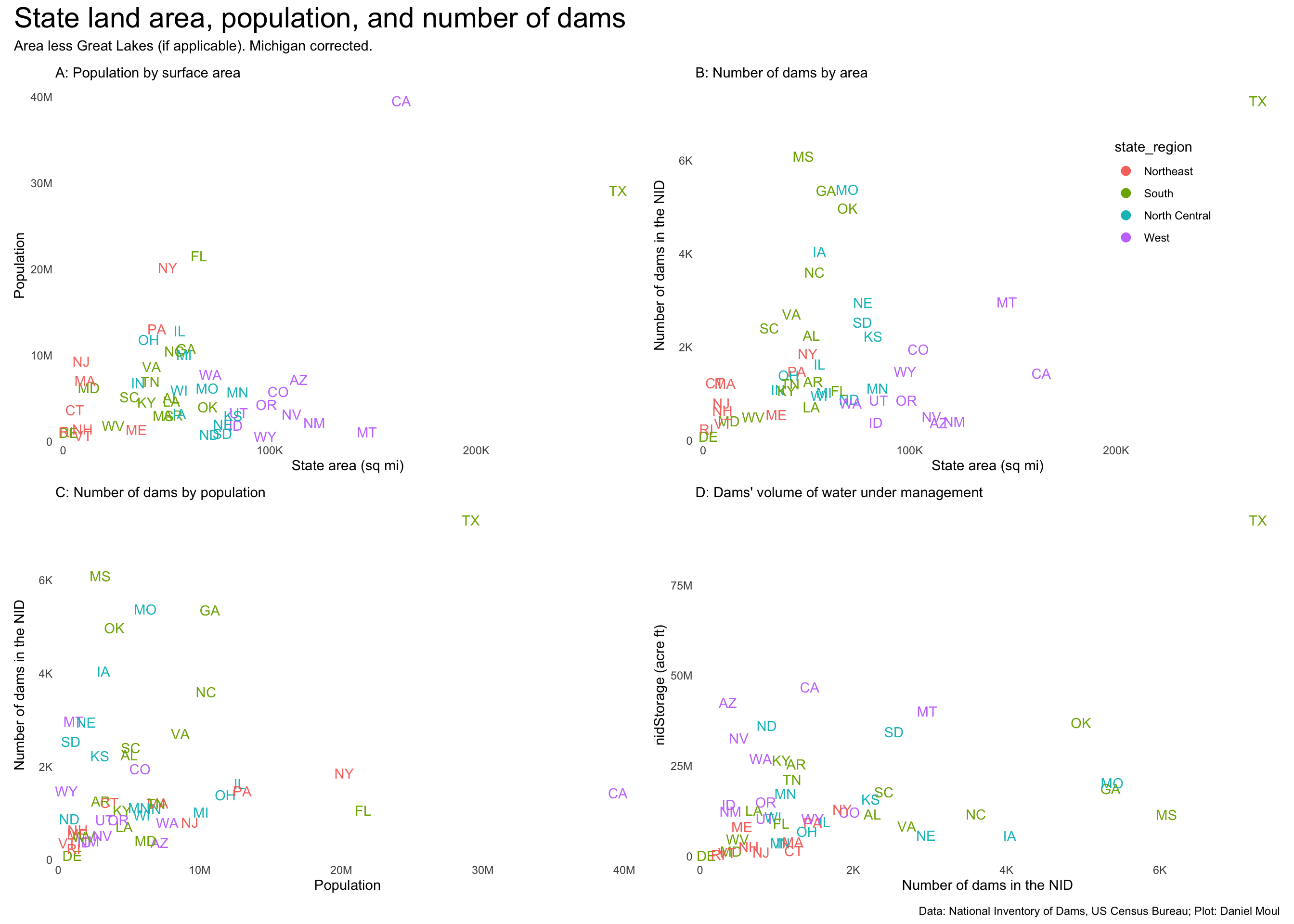 p1 <- dams_by_state_with_pop |>ggplot() +geom_text(aes(usgs_total_area_less_great_lakes, pop, label = state_abb, color = state_region),check_overlap =FALSE,show.legend =FALSE,key_glyph ="point") +scale_x_continuous(labels =label_number(scale_cut =cut_short_scale()),expand =expansion(mult =c(0.02, 0.04))) +scale_y_continuous(labels =label_number(scale_cut =cut_short_scale()),expand =expansion(mult =c(0.02, 0.04))) +labs(subtitle ="A: Population by surface area",x ="State area (sq mi)",y ="Population" )p2 <- dams_by_state_with_pop |>ggplot() +geom_text(aes(usgs_total_area_less_great_lakes, n, label = state_abb, color = state_region),check_overlap =FALSE,key_glyph ="point") +scale_x_continuous(labels =label_number(scale_cut =cut_short_scale()),expand =expansion(mult =c(0.02, 0.04))) +scale_y_continuous(labels =label_number(scale_cut =cut_short_scale()),expand =expansion(mult =c(0.02, 0.04))) +guides(color =guide_legend(position ="inside",override.aes =list(size =3))) +theme(legend.position.inside =c(0.8, 0.7)) +labs(subtitle ="B: Number of dams by area",x ="State area (sq mi)",y ="Number of dams in the NID" )p3 <- dams_by_state_with_pop |>ggplot() +geom_text(aes(pop, n, label = state_abb, color = state_region),check_overlap =FALSE,show.legend =FALSE,key_glyph ="point") +scale_x_continuous(labels =label_number(scale_cut =cut_short_scale()),expand =expansion(mult =c(0.02, 0.04))) +scale_y_continuous(labels =label_number(scale_cut =cut_short_scale()),expand =expansion(mult =c(0.02, 0.04))) +labs(subtitle ="C: Number of dams by population",x ="Population",y ="Number of dams in the NID" )p4 <- dams_by_state_with_pop |>left_join( storage_by_state_mi_corrected |>select(state_abb, nidStorage = n),by ="state_abb" ) |>ggplot() +geom_text(aes(n, nidStorage, label = state_abb, color = state_region),check_overlap =FALSE,show.legend =FALSE,key_glyph ="point") +scale_x_continuous(labels =label_number(scale_cut =cut_short_scale()),expand =expansion(mult =c(0.02, 0.04))) +scale_y_continuous(labels =label_number(scale_cut =cut_short_scale()),expand =expansion(mult =c(0.02, 0.04))) +labs(subtitle ="D: Dams' volume of water under management",x ="Number of dams in the NID",y ="nidStorage (acre ft)" )p1 + p2 + p3 + p4 +plot_annotation(title ="State land area, population, and number of dams",subtitle ="Area less Great Lakes (if applicable). Michigan corrected.",caption = my_caption_nid_census )