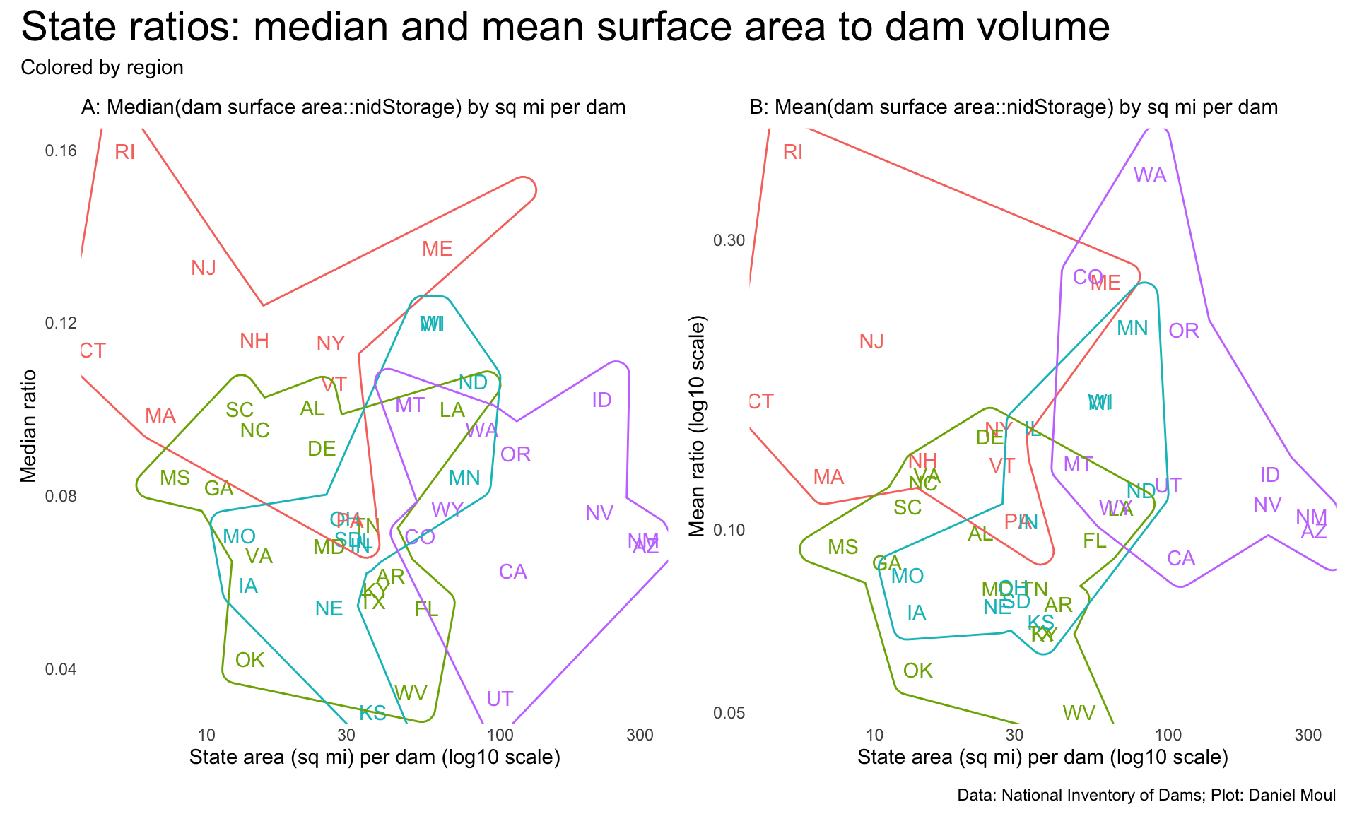 p1 <- dams_ratios_per_state |>ggplot(aes(sqmi_per_dam, median_surface_area_to_nidStorage, color = state_region)) +geom_text(aes(label = state_abb),check_overlap =FALSE,show.legend =FALSE,key_glyph ="point") +geom_mark_hull() +scale_x_log10(labels =label_number(scale_cut =cut_short_scale()),expand =expansion(mult =c(0.02, 0.04))) +scale_y_continuous(labels =label_number(scale_cut =cut_short_scale()),expand =expansion(mult =c(0.02, 0.04))) +guides(color ="none") +labs(subtitle ="A: Median(dam surface area::nidStorage) by sq mi per dam",x ="State area (sq mi) per dam (log10 scale)",y ="Median ratio" )p2 <- dams_ratios_per_state |>ggplot(aes(sqmi_per_dam, avg_surface_area_to_nidStorage, color = state_region)) +geom_text(aes(label = state_abb),check_overlap =FALSE,show.legend =FALSE,key_glyph ="point") +geom_mark_hull() +scale_x_log10(labels =label_number(scale_cut =cut_short_scale()),expand =expansion(mult =c(0.02, 0.04))) +scale_y_log10(labels =label_number(scale_cut =cut_short_scale()),expand =expansion(mult =c(0.02, 0.04))) +guides(color ="none") +labs(subtitle ="B: Mean(dam surface area::nidStorage) by sq mi per dam",x ="State area (sq mi) per dam (log10 scale)",y ="Mean ratio (log10 scale)" )p1 + p2 +plot_annotation(title ="State ratios: median and mean surface area to dam volume",subtitle ="Colored by region",caption = my_caption )