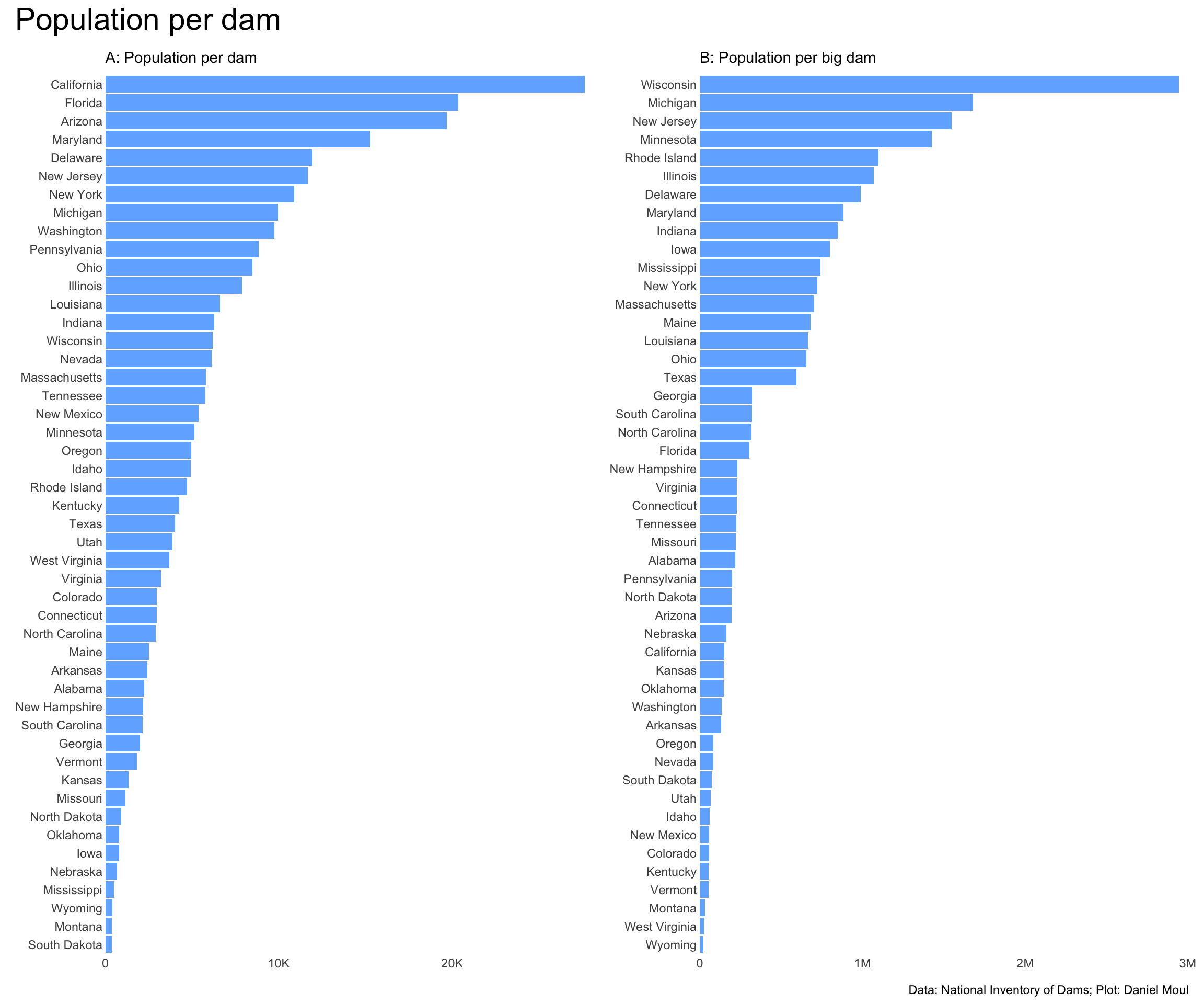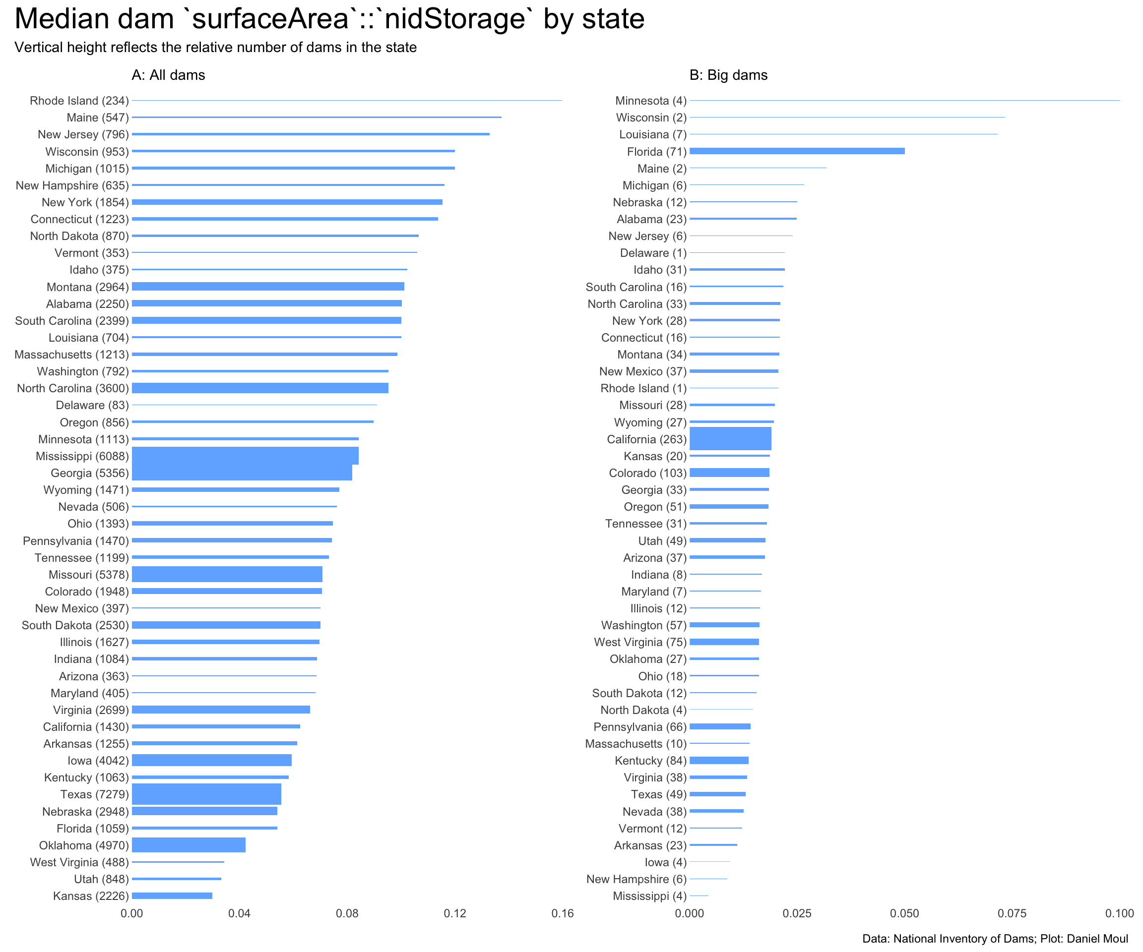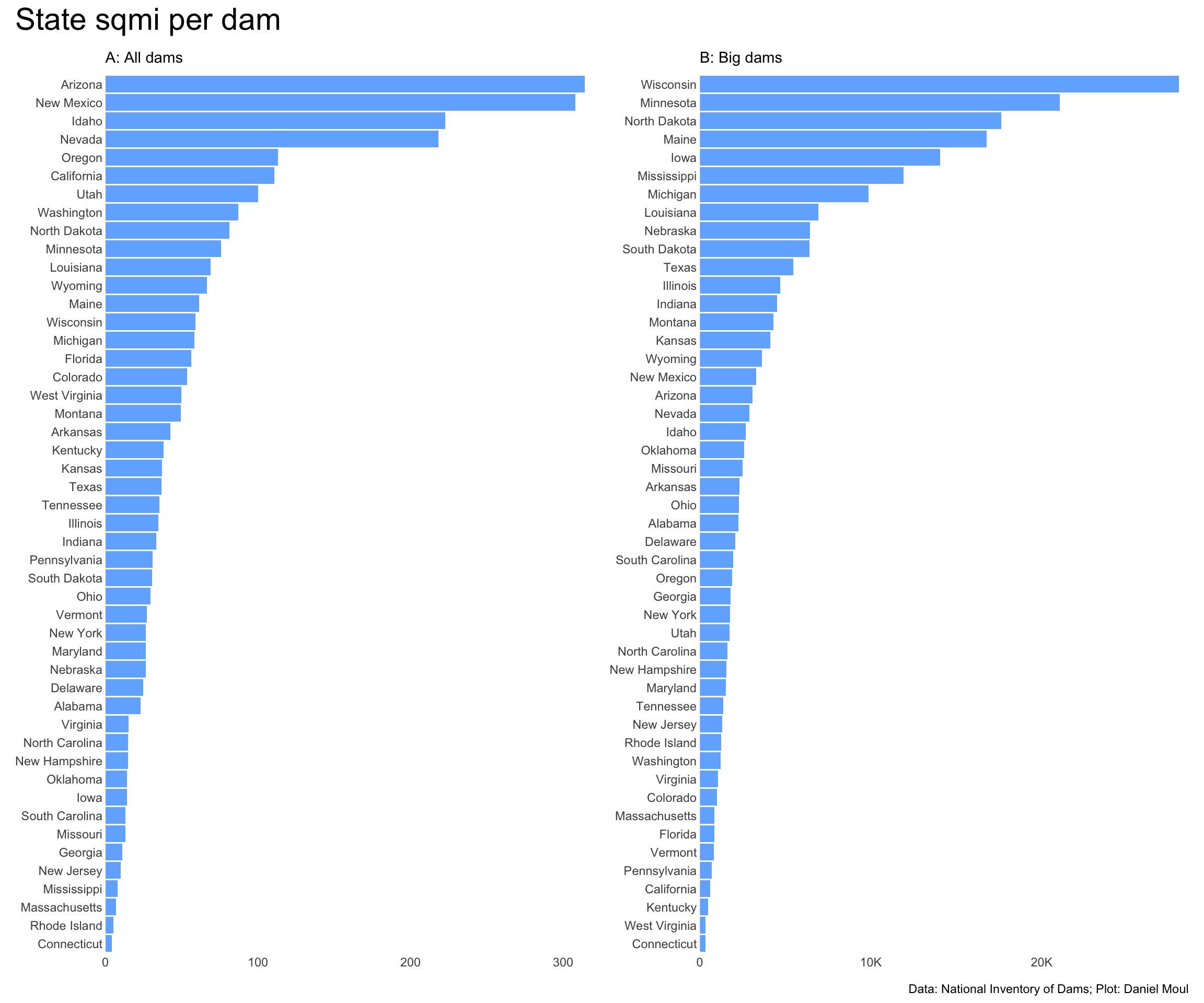 I’m surprised Florida is so low in the ranking in panel A, given it’s such a flat state. Also that it has 71 big dams (panel B).