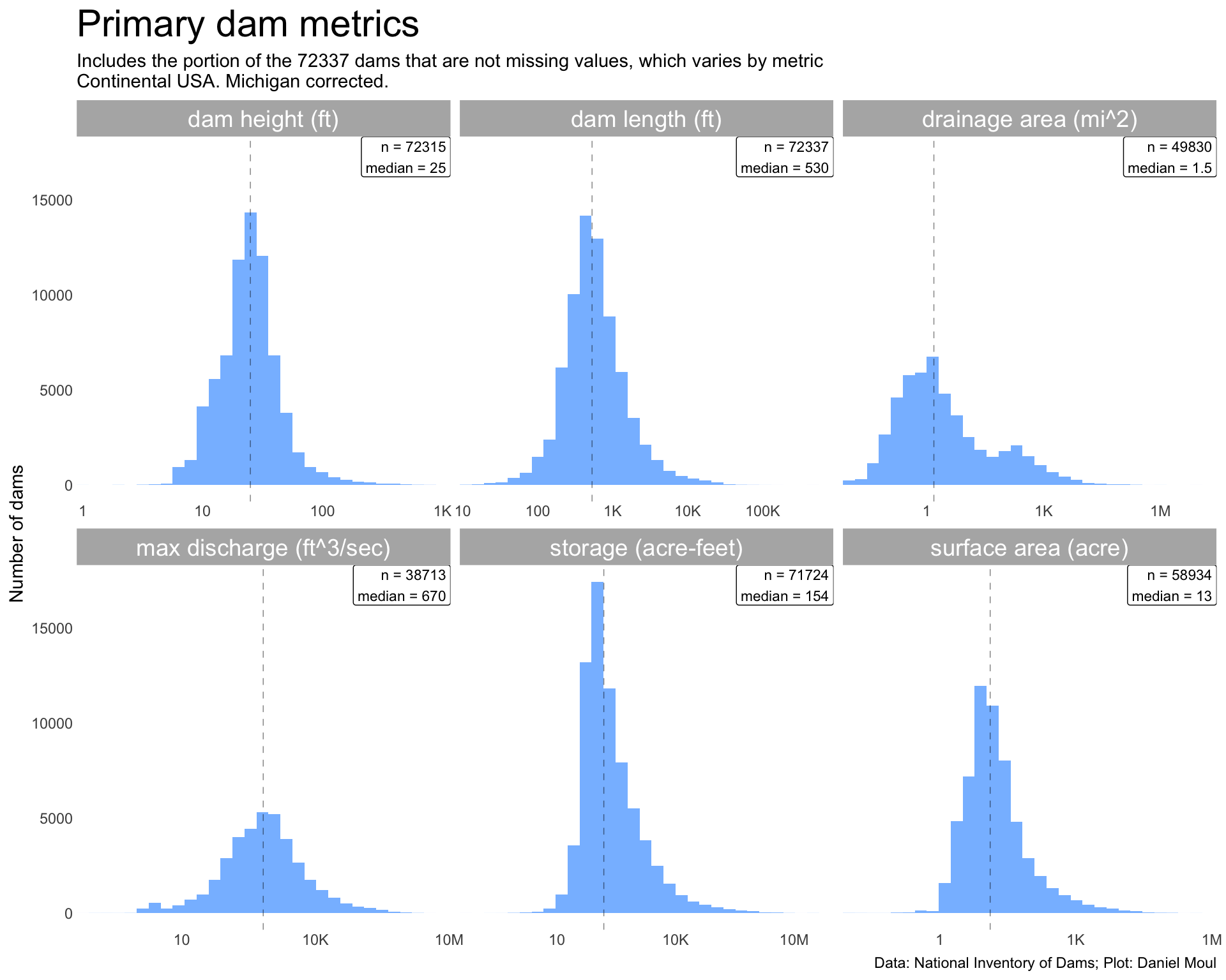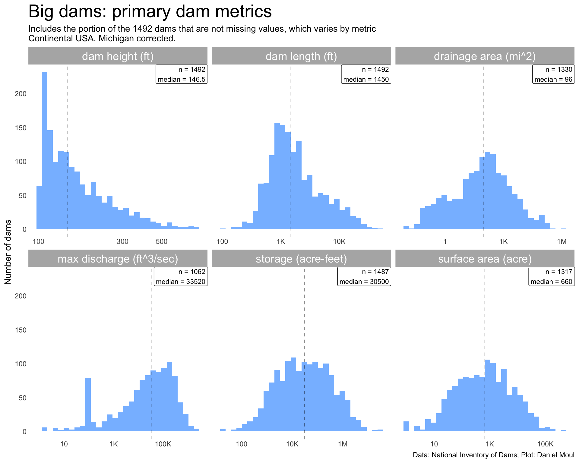 dta_for_plot <- dams |>st_drop_geometry() |>select(name, state, big_dam, nidId, nidStorage, nidHeight, damLength, surfaceArea, drainageArea, maxDischarge) |>filter(big_dam) |>filter(nidId !="MI00650") |>filter(damLength >10)dta_for_plot_long <- dta_for_plot |>pivot_longer(cols = nidStorage:maxDischarge,names_to ="metric",values_to ="value" ) |>filter(value >0) |>mutate(metric_label =case_match( metric,"damLength"~"dam length (ft)","nidHeight"~"dam height (ft)","drainageArea"~"drainage area (mi^2)","maxDischarge"~"max discharge (ft^3/sec)","surfaceArea"~"surface area (acre)","nidStorage"~"storage (acre-feet)",.default =glue("error: {metric}") ))dta_for_plot_medians = dta_for_plot_long |>reframe(value =median(value),n_dams =n(),.by = metric_label)n_dams_big <-nrow(dta_for_plot)dta_for_plot_long |>ggplot() +geom_histogram(aes(value),bins =30) +geom_vline(data = dta_for_plot_medians,aes(xintercept = value),lty =2,linewidth =0.25,alpha =0.5) +geom_label(data = dta_for_plot_medians,aes(x =Inf, y =Inf, label =glue("n = {n_dams}\nmedian = {round(value, digits = 1)}")),hjust =1, vjust =1,size =3) +scale_x_log10(label =label_number(scale_cut =cut_short_scale())) +facet_wrap(~metric_label, scales ="free_x") +labs(title ="Big dams: primary dam metrics",subtitle =glue("Includes the portion of the {n_dams_big} dams that are not missing values, which varies by metric","\nContinental USA. Michigan corrected."),x =NULL,y ="Number of dams",caption = my_caption )