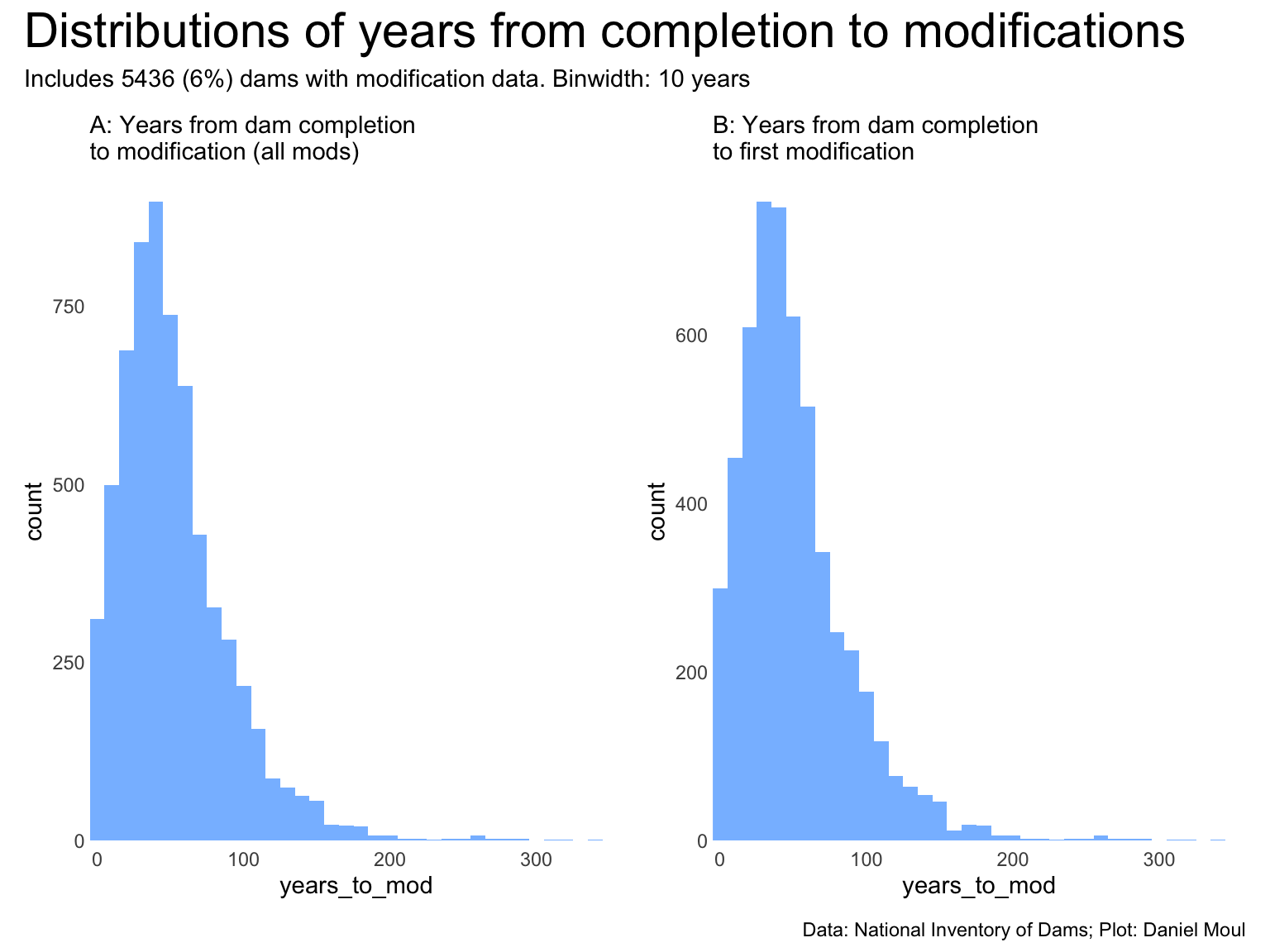 In Figure 6.25 above we see the distribution of years from completion to any mod (Figure 6.25 panel A) and to the first model (panel B). The distributions have a similar shape–partly because 85% of dams with modification data are for the first modification.