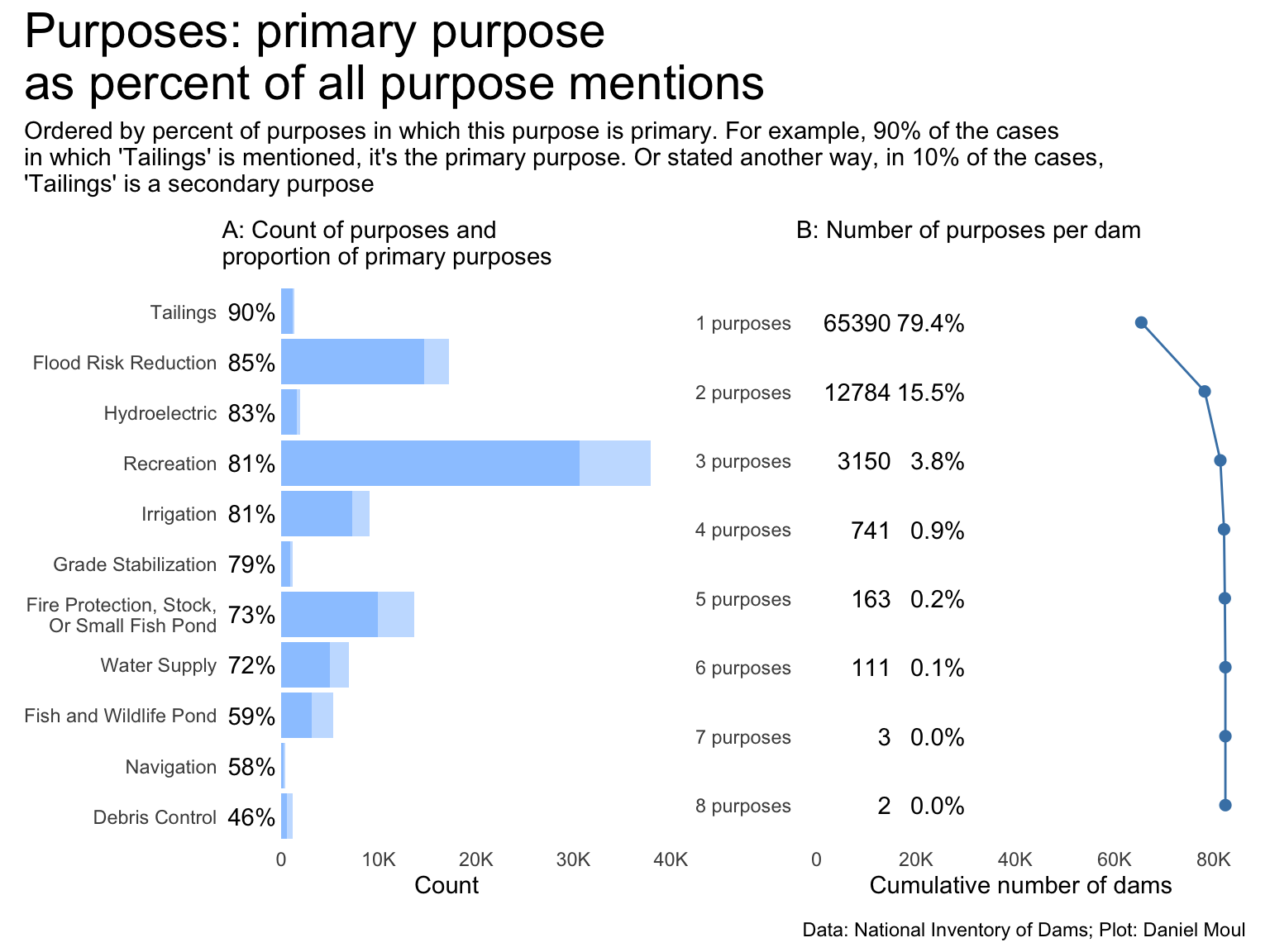 purposes_primary <- dams_no_geo |>count(primaryPurposeId)purposes_secondary <- dams_no_geo_all_purposes |>count(purpose_id)purposes_compared <-left_join( purposes_primary |>rename(purpose_id = primaryPurposeId), purposes_secondary,by ="purpose_id",suffix =c("_primary", "_all") ) |>filter(purpose_id !="Other or not specified") |>mutate(pct_primary_of_all = n_primary / n_all)p1 <- purposes_compared |>mutate(purpose_id =fct_reorder(purpose_id, pct_primary_of_all)) |>ggplot() +geom_col(aes(n_all, purpose_id),alpha =0.3) +geom_col(aes(n_primary, purpose_id),alpha =0.3) +geom_text(aes(-10, purpose_id, label =percent(pct_primary_of_all, accuracy =1)),nudge_x =-500,hjust =1) +scale_x_continuous(label =label_number(scale_cut =cut_short_scale())) +expand_limits(x =-4000) +labs(subtitle ="A: Count of purposes and\nproportion of primary purposes",x ="Count",y =NULL )tailings_pct <- purposes_compared |>filter(purpose_id =="Tailings") |>pull(pct_primary_of_all)p2 <- dams_no_geo |>mutate(n_purposes =str_count(purposeIds, ";") +1) |>ggplot() +geom_histogram(aes(n_purposes),binwidth =1) +scale_y_continuous(label =label_number(scale_cut =cut_short_scale())) +labs(subtitle ="B: Number of purposes per dam",x =NULL,y ="Count" )p2 <- dams_no_geo |>mutate(n_purposes =str_count(purposeIds, ";") +1) |>filter(!is.na(n_purposes)) |>arrange(desc(n_purposes)) |>count(n_purposes) |>arrange(desc(n)) |>mutate(pct_n = n /sum(n),n_cum =cumsum(n),n_purpose_label =glue("{n_purposes} purposes"),n_purpose_label =fct_rev(n_purpose_label),tmp =0) |>ggplot() +geom_line(aes(n_cum, n_purpose_label, group = tmp),linewidth =0.5,color ="steelblue") +geom_point(aes(n_cum, n_purpose_label, group = tmp),size =2,color ="steelblue") +geom_text(aes(x =15000, y = n_purpose_label, label = n),hjust =1) +geom_text(aes(x =30000, y = n_purpose_label, label =percent(pct_n, accuracy =0.1)),hjust =1) +scale_x_continuous(label =label_number(scale_cut =cut_short_scale())) +expand_limits(x =0) +labs(subtitle ="B: Number of purposes per dam",x ="Cumulative number of dams",y =NULL )p1 + p2 +plot_annotation(title ="Purposes: primary purpose\nas percent of all purpose mentions",subtitle =glue("Ordered by percent of purposes in which this purpose is primary. For example,"," {percent(tailings_pct, accuracy = 1)} of the cases","\nin which 'Tailings' is mentioned, it's the primary purpose.", " Or stated another way,"," in {percent(1 - tailings_pct, accuracy = 1)} of the cases,","\n'Tailings' is a secondary purpose"),caption = my_caption )