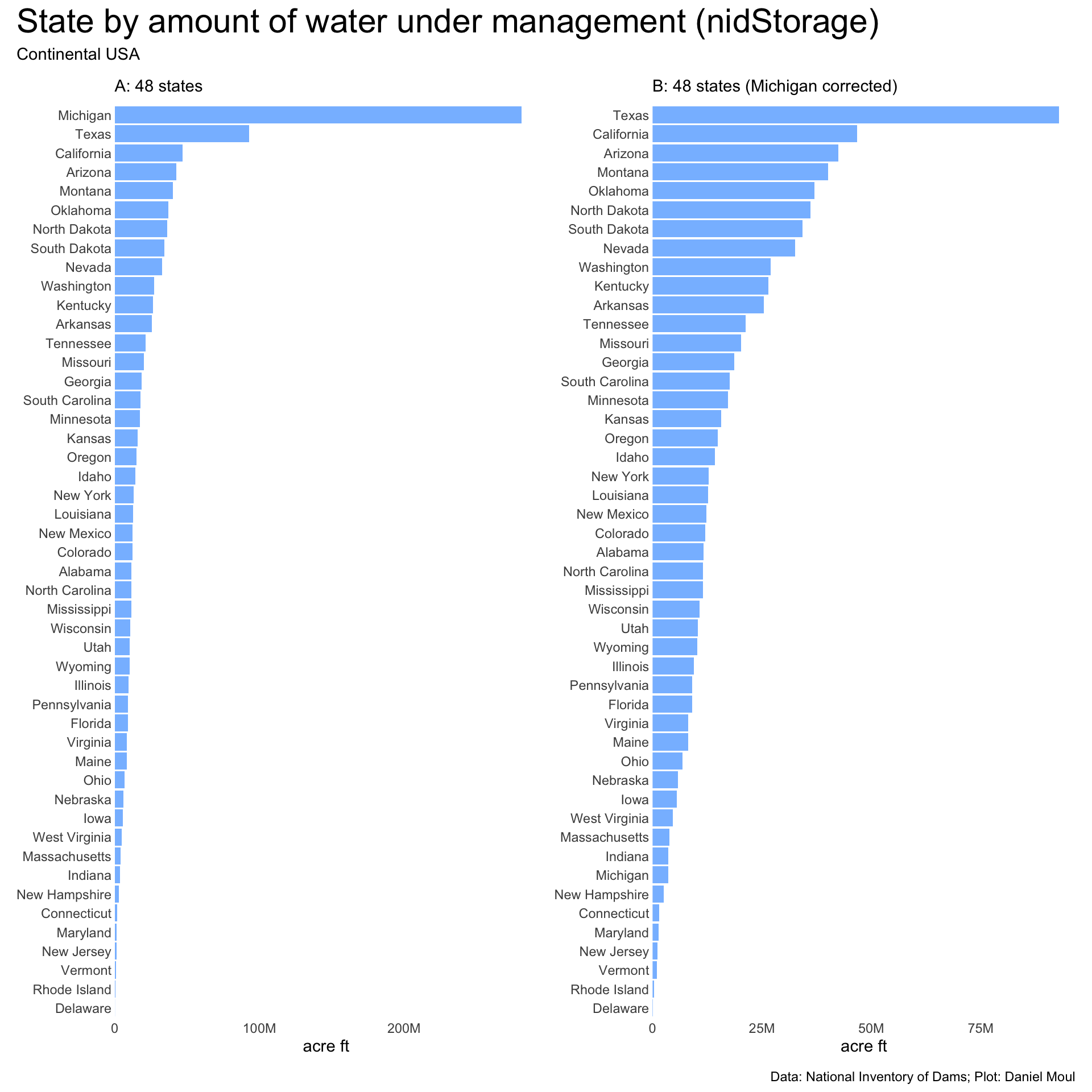 The amount of water under management by state needs a correction before we can use it. In Figure 6.2 panel A, Michigan is shown as having so much more water under management than other states because of one structure: Soo Locks in Sault Ste. Marie (nidID MI00650), through which ships travel between Lake Superior and the other Great Lakes. Because of Soo Locks, Michigan “claims” nearly 278M acre-feet of water in Lake Superior. Removing this one structure in panel B moves Michigan down the ranking to 42 of 48 states. Where I’m not looking at nidStorage, I leave Soo Locks in the data sets. Where I remove it, the plot includes the note: “Michigan corrected”.