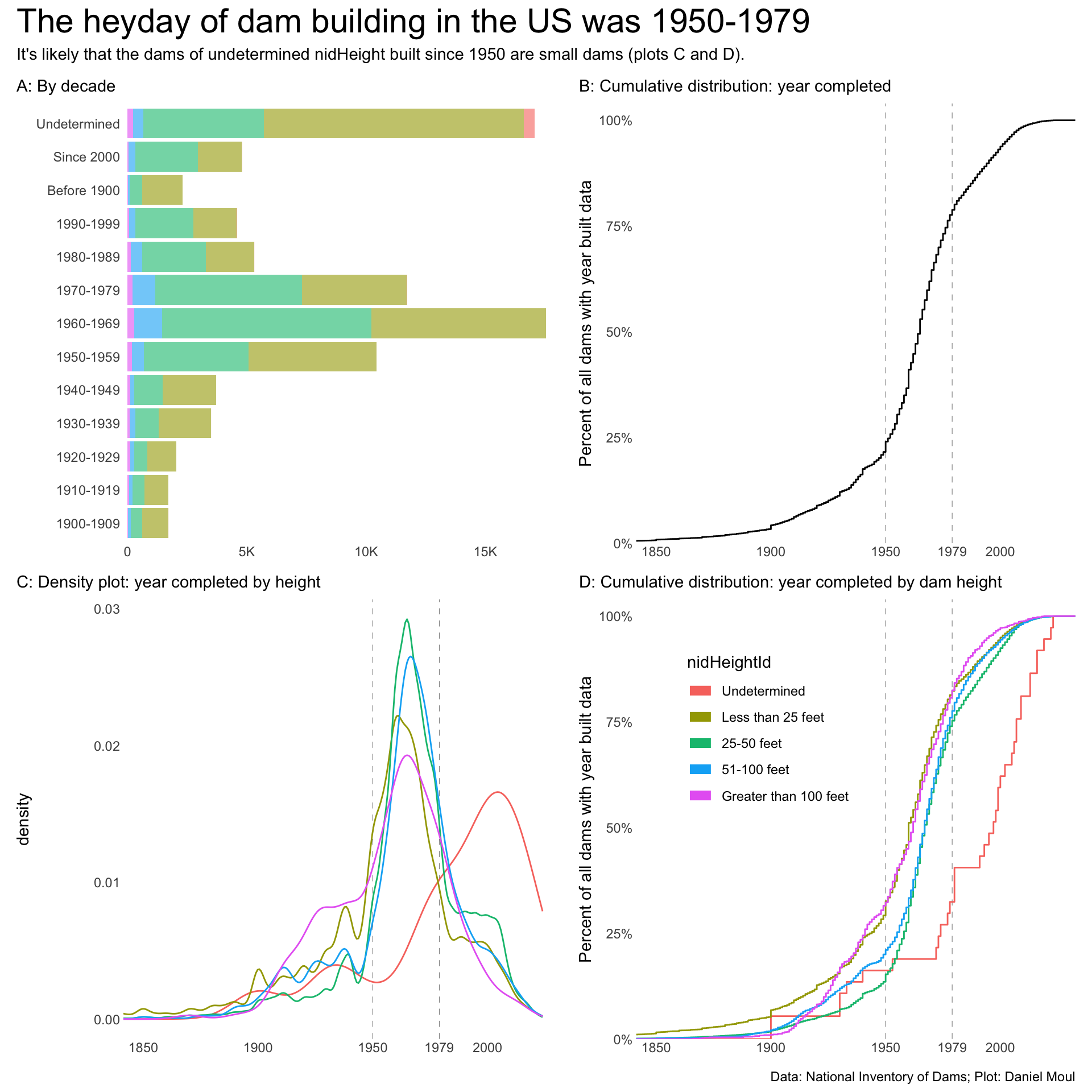 dta_for_plot <- dams_no_geo |>select(name, state, nidHeight, nidHeightId, yearCompleted, yearCompletedId, yearsModified)p1 <- dta_for_plot |>ggplot() +geom_bar(aes(yearCompletedId, fill = nidHeightId)) +# scale_x_continuous(expand = expansion(mult = c(0.01, 0.04))) +scale_y_continuous(label =label_number(scale_cut =cut_short_scale()),expand =expansion(mult =c(0.01, 0.04))) +guides(fill ="none") +coord_flip() +theme(plot.title.position ="plot") +labs(subtitle ="A: By decade",x =NULL,y =NULL )p2 <- dta_for_plot |>filter(yearCompletedId !="Undetermined") |>ggplot() +geom_vline(xintercept =c(1950, 1979),lty =2,linewidth =0.2,alpha =0.5) +stat_ecdf(aes(yearCompleted)) +scale_x_continuous(breaks =c(1850, 1900, 1950, 1979, 2000)) +scale_y_continuous(label =label_percent(),expand =expansion(mult =c(0.0, 0.04))) +theme(plot.title.position ="plot") +coord_cartesian(xlim =c(1850, NA)) +labs(subtitle ="B: Cumulative distribution: year completed",x =NULL,y ="Percent of all dams with year built data" )p3 <- dta_for_plot |>filter(yearCompletedId !="Undetermined") |>ggplot() +geom_vline(xintercept =c(1950, 1979),lty =2,linewidth =0.2,alpha =0.5) +geom_density(aes(yearCompleted, color = nidHeightId)) +scale_x_continuous(breaks =c(1850, 1900, 1950, 1979, 2000)) +guides(color ="none") +theme(plot.title.position ="plot") +coord_cartesian(xlim =c(1850, NA)) +labs(subtitle ="C: Density plot: year completed by height",x =NULL )p4 <- dta_for_plot |>filter(yearCompletedId !="Undetermined") |>ggplot() +geom_vline(xintercept =c(1950, 1979),lty =2,linewidth =0.2,alpha =0.5) +stat_ecdf(aes(yearCompleted, color = nidHeightId)) +scale_x_continuous(breaks =c(1850, 1900, 1950, 1979, 2000)) +scale_y_continuous(label =label_percent(),expand =expansion(mult =c(0.0, 0.04))) +guides(color =guide_legend(position ="inside",override.aes =list(linewidth =3))) +theme(plot.title.position ="plot",legend.position.inside =c(0.3, 0.7)) +coord_cartesian(xlim =c(1850, NA)) +labs(subtitle ="D: Cumulative distribution: year completed by dam height",x =NULL,y ="Percent of all dams with year built data" )p1 + p2 + p3 + p4 +plot_annotation(title ="The heyday of dam building in the US was 1950-1979",subtitle ="It's likely that the dams of undetermined nidHeight built since 1950 are small dams (plots C and D).",caption = my_caption )