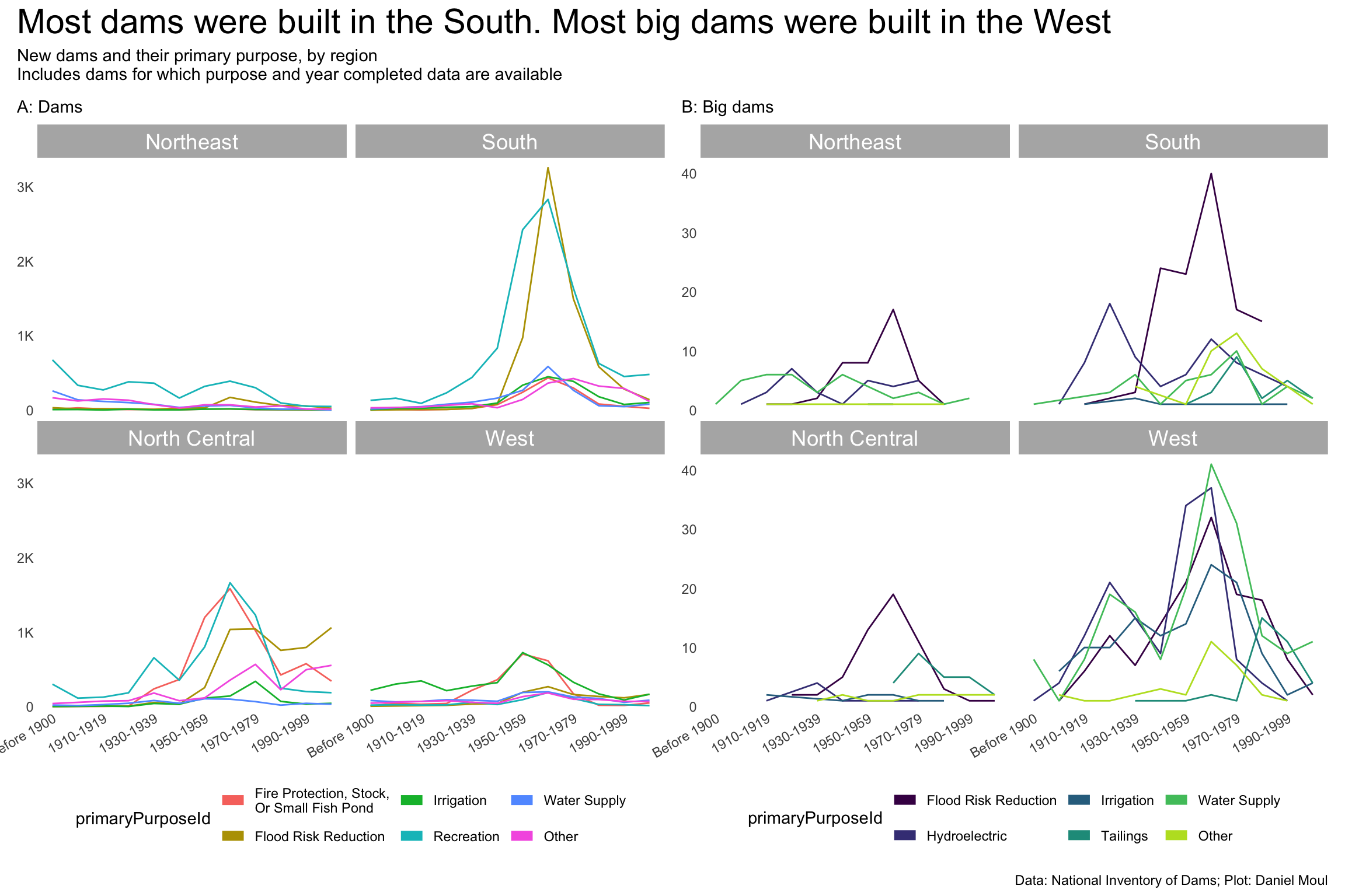 yearCompletedId_levels <-c("Before 1900", "1900-1909", "1910-1919", "1920-1929", "1930-1939","1940-1949", "1950-1959", "1960-1969", "1970-1979", "1980-1989","1990-1999", "Since 2000", "Undetermined")yearCompletedId_breaks <-c("Before 1900", # "1900-1909", "1910-1919", # "1920-1929", "1930-1939", # "1940-1949", "1950-1959", # "1960-1969", "1970-1979", # "1980-1989","1990-1999"# , "Since 2000", "Undetermined" )year_build_by_primary_purpose <- dams_no_geo |>select(nidId, primaryOwnerTypeId, primaryPurposeId, state, state_abb, state_region, nidStorage, yearCompleted, yearCompletedId) |>filter(yearCompletedId !="Undetermined", primaryPurposeId !="Other or not specified") |>mutate(yearCompletedId =factor(yearCompletedId, levels = yearCompletedId_levels, ordered =TRUE)) |>mutate(primaryPurposeId =fct_lump_n(primaryPurposeId, n =5)) |>count(yearCompletedId, primaryPurposeId, state_region)year_build_by_primary_purpose_big_dams <- dams_no_geo |>select(nidId, primaryOwnerTypeId, primaryPurposeId, state, state_abb, state_region, nidStorage, yearCompleted, yearCompletedId, big_dam) |>filter(yearCompletedId !="Undetermined", primaryPurposeId !="Other or not specified") |>mutate(yearCompletedId =factor(yearCompletedId, levels = yearCompletedId_levels, ordered =TRUE)) |>filter(big_dam) |>mutate(primaryPurposeId =fct_lump_n(primaryPurposeId, n =5)) |>count(yearCompletedId, primaryPurposeId, state_region)p1 <- year_build_by_primary_purpose |>ggplot() +geom_line(aes(yearCompletedId, n, color = primaryPurposeId, group = primaryPurposeId)) +# geom_point(aes(yearCompletedId, n, color = primaryPurposeId),# size = 0.75,# show.legend = FALSE) +scale_x_discrete(breaks = yearCompletedId_breaks) +scale_y_continuous(label =label_number(scale_cut =cut_short_scale()),expand =expansion(mult =c(0.01, 0.04))) +guides(color =guide_legend(#position = "inside",override.aes =list(linewidth =3))) +expand_limits(y =0) +facet_wrap(~state_region) +theme(plot.title.position ="plot",# legend.position.inside = c(I(0.15), I(0.85)),legend.position ="bottom",axis.text.x =element_text(angle =30, hjust =1)) +labs(subtitle ="A: Dams",x =NULL,y =NULL )p2 <- year_build_by_primary_purpose_big_dams |>ggplot() +geom_line(aes(yearCompletedId, n, color = primaryPurposeId, group = primaryPurposeId)) +# geom_point(aes(yearCompletedId, n, color = primaryPurposeId),# size = 0.75,# show.legend = FALSE) +scale_x_discrete(breaks = yearCompletedId_breaks) +scale_y_continuous(label =label_number(scale_cut =cut_short_scale()),expand =expansion(mult =c(0.01, 0.04))) +scale_color_viridis_d(end =0.9) +guides(color =guide_legend(#position = "inside",override.aes =list(linewidth =3))) +expand_limits(y =0) +facet_wrap(~state_region) +theme(plot.title.position ="plot",# legend.position.inside = c(I(0.15), I(0.85)),legend.position ="bottom",axis.text.x =element_text(angle =30, hjust =1)) +labs(subtitle ="B: Big dams",x =NULL,y =NULL )p1 + p2 +plot_annotation(title ="Most dams were built in the South. Most big dams were built in the West",subtitle =glue("New dams and their primary purpose, by region","\nIncludes dams for which purpose and year completed data are available"),caption = my_caption )