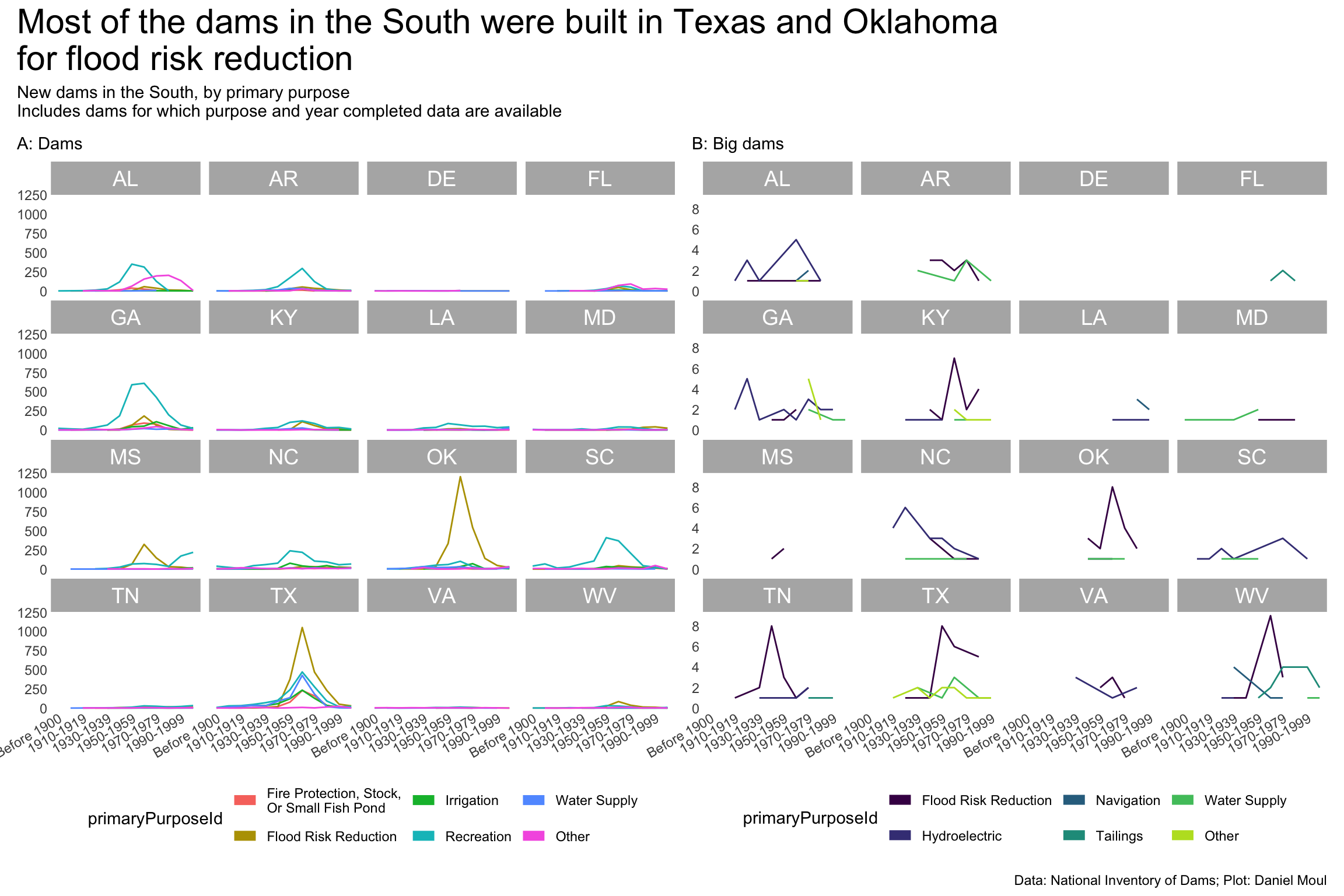 year_build_by_primary_purpose <- dams_no_geo |>filter(state_region =="South") |>filter(yearCompletedId !="Undetermined", primaryPurposeId !="Other or not specified") |>select(nidId, primaryOwnerTypeId, primaryPurposeId, state, state_abb, state_region, nidStorage, yearCompleted, yearCompletedId) |>mutate(yearCompletedId =factor(yearCompletedId, levels = yearCompletedId_levels, ordered =TRUE)) |>mutate(primaryPurposeId =fct_lump_n(primaryPurposeId, n =5)) |>count(yearCompletedId, primaryPurposeId, state_region, state_abb)year_build_by_primary_purpose_big_dams <- dams_no_geo |>filter(big_dam) |>filter(state_region =="South") |>filter(yearCompletedId !="Undetermined", primaryPurposeId !="Other or not specified") |>select(nidId, primaryOwnerTypeId, primaryPurposeId, state, state_abb, state_region, nidStorage, yearCompleted, yearCompletedId) |>mutate(yearCompletedId =factor(yearCompletedId, levels = yearCompletedId_levels, ordered =TRUE)) |>mutate(primaryPurposeId =fct_lump_n(primaryPurposeId, n =5)) |>count(yearCompletedId, primaryPurposeId, state_region, state_abb)p1 <- year_build_by_primary_purpose |>ggplot() +geom_line(aes(yearCompletedId, n, color = primaryPurposeId, group = primaryPurposeId)) +# geom_point(aes(yearCompletedId, n, color = primaryPurposeId),# size = 0.75,# show.legend = FALSE) +scale_x_discrete(breaks = yearCompletedId_breaks) +scale_y_continuous(#label = label_number(scale_cut = cut_short_scale()),expand =expansion(mult =c(0.01, 0.04))) +guides(color =guide_legend(# position = "inside",override.aes =list(linewidth =3))) +expand_limits(y =0) +facet_wrap(~state_abb) +theme(plot.title.position ="plot",# legend.position.inside = c(I(0.15), I(0.85)),legend.position ="bottom",axis.text.x =element_text(angle =30, hjust =1)) +labs(subtitle ="A: Dams",x =NULL,y =NULL )p2 <- year_build_by_primary_purpose_big_dams |>ggplot() +geom_line(aes(yearCompletedId, n, color = primaryPurposeId, group = primaryPurposeId)) +# geom_point(aes(yearCompletedId, n, color = primaryPurposeId),# size = 0.75,# show.legend = FALSE) +scale_x_discrete(breaks = yearCompletedId_breaks) +scale_y_continuous(breaks =2*0:5,#label = label_number(scale_cut = cut_short_scale()),expand =expansion(mult =c(0.01, 0.04))) +scale_color_viridis_d(end =0.9) +guides(color =guide_legend(# position = "inside",override.aes =list(linewidth =3))) +expand_limits(y =0) +facet_wrap(~state_abb) +theme(plot.title.position ="plot",# legend.position.inside = c(I(0.15), I(0.85)),legend.position ="bottom",axis.text.x =element_text(angle =30, hjust =1)) +labs(subtitle ="B: Big dams",x =NULL,y =NULL )p1 + p2 +plot_annotation(title =glue("Most of the dams in the South were built in Texas and Oklahoma", "\nfor flood risk reduction"),subtitle =glue("New dams in the South, by primary purpose","\nIncludes dams for which purpose and year completed data are available"),caption = my_caption )