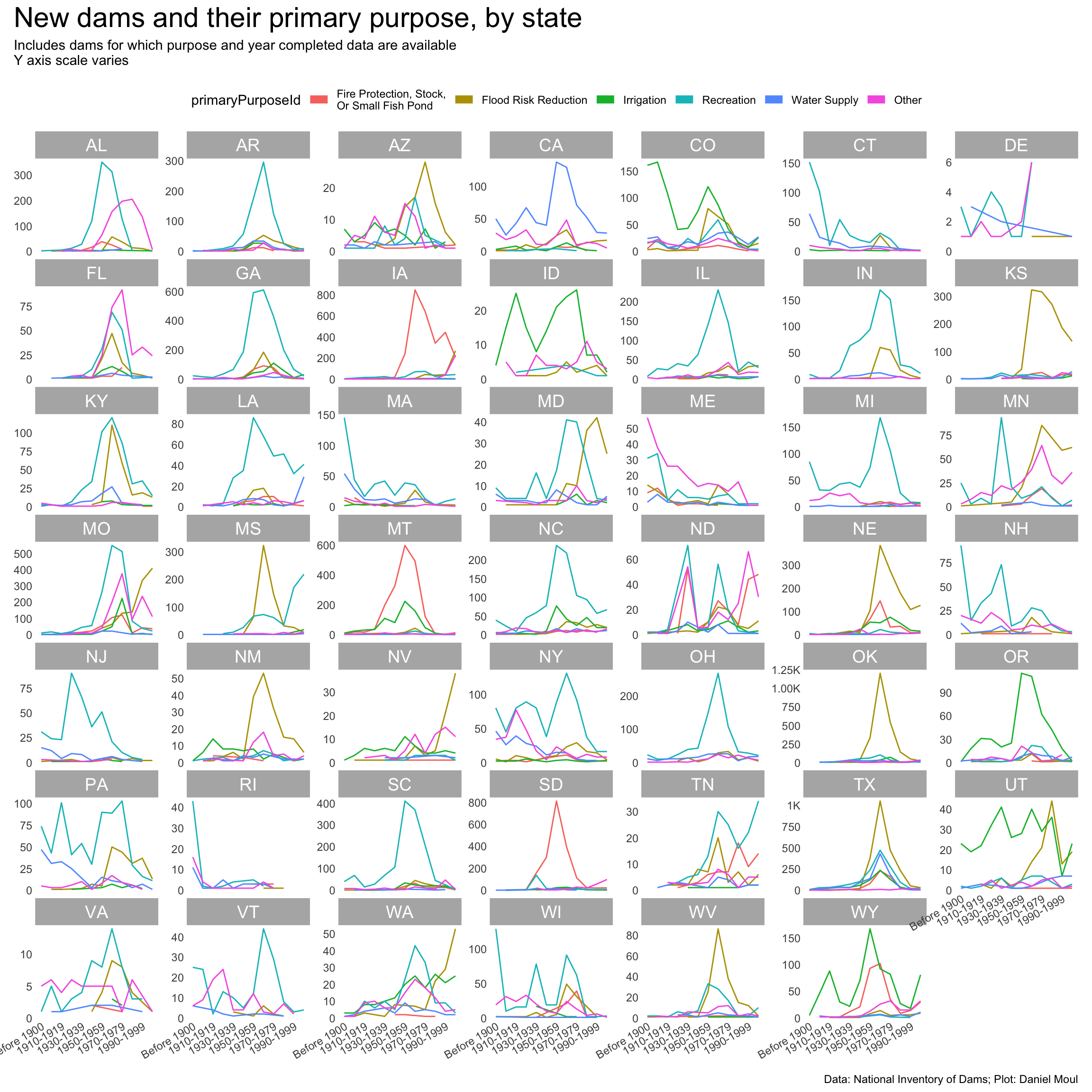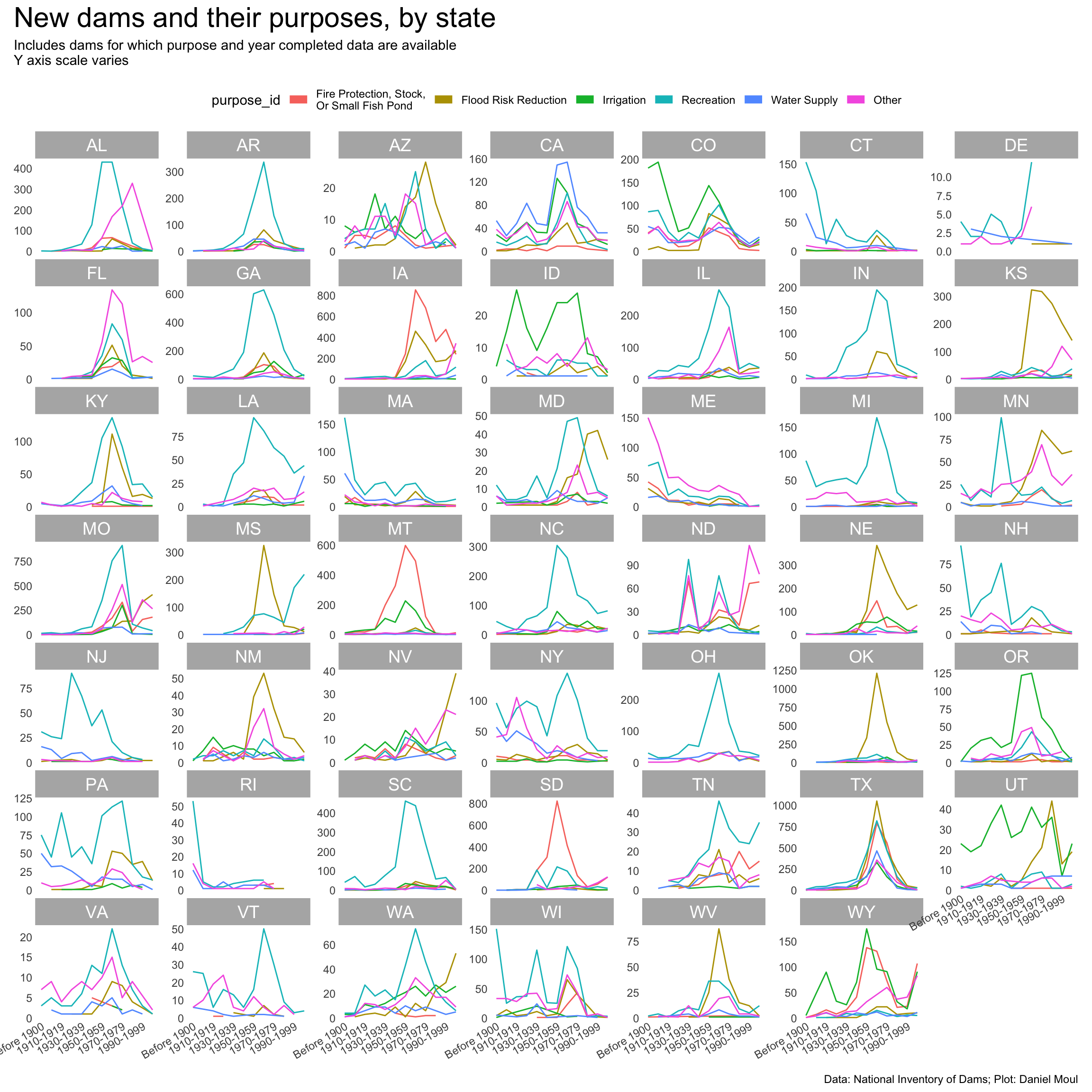 year_build_by_primary_purpose <- dams_no_geo |>left_join(dams_no_geo_all_purposes |>select(nidId, purpose_id),by =join_by(nidId)) |>filter(yearCompletedId !="Undetermined", primaryPurposeId !="Other or not specified") |>select(nidId, primaryOwnerTypeId, primaryPurposeId, purpose_id, state, state_abb, state_region, nidStorage, yearCompleted, yearCompletedId) |>mutate(yearCompletedId =factor(yearCompletedId, levels = yearCompletedId_levels, ordered =TRUE)) |>mutate(purpose_id =fct_lump_n(purpose_id, n =5)) |>count(yearCompletedId, purpose_id, state_region, state_abb)p1 <- year_build_by_primary_purpose |>ggplot() +geom_line(aes(yearCompletedId, n, color = purpose_id, group = purpose_id)) +# geom_point(aes(yearCompletedId, n, color = primaryPurposeId),# size = 0.75,# show.legend = FALSE) +scale_x_discrete(breaks = yearCompletedId_breaks) +scale_y_continuous(#label = label_number(scale_cut = cut_short_scale()),expand =expansion(mult =c(0.01, 0.04))) +guides(color =guide_legend(override.aes =list(linewidth =3),nrow =1)) +expand_limits(y =0) +facet_wrap(~state_abb, scales ="free_y") +theme(plot.title.position ="plot",legend.position ="top",axis.text.x =element_text(angle =30, hjust =1) ) +labs(x =NULL,y =NULL )p1 +plot_annotation(title ="New dams and their purposes, by state",subtitle =glue("Includes dams for which purpose and year completed data are available", "\nY axis scale varies"),caption = my_caption )