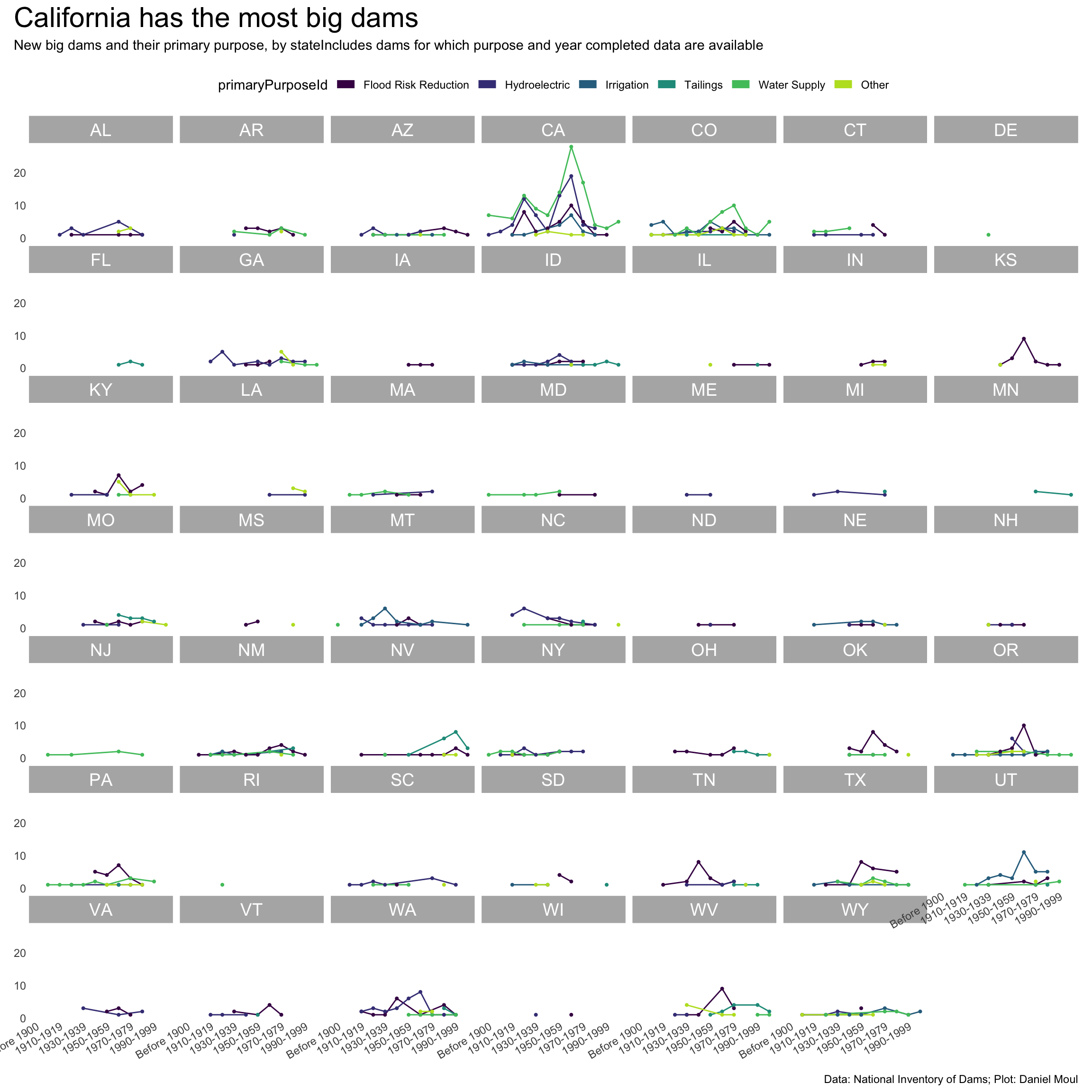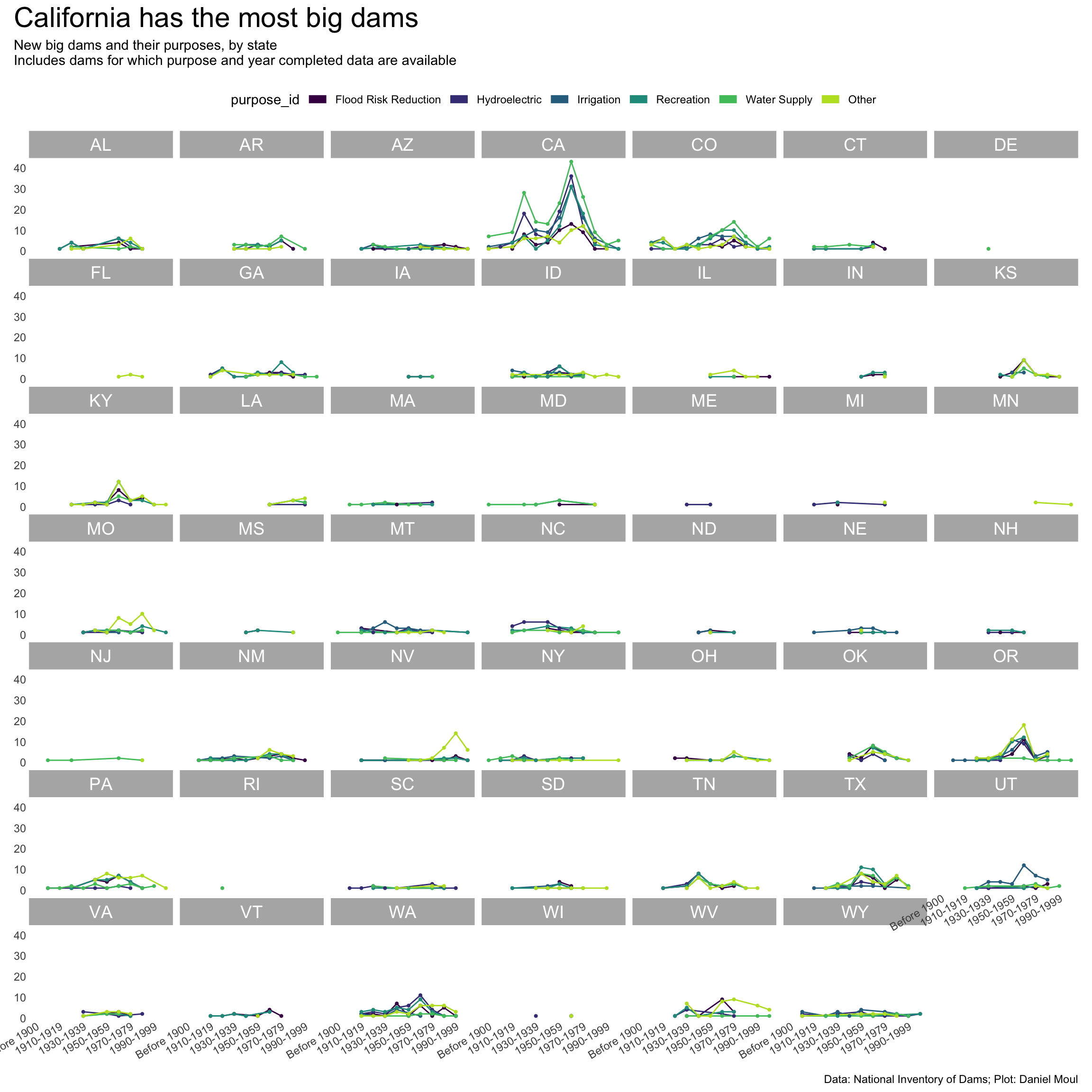 year_build_by_primary_purpose_big_dams <- dams_no_geo |>filter(big_dam) |># filter(state_region == "South") |>filter(yearCompletedId !="Undetermined", primaryPurposeId !="Other or not specified") |>select(nidId, primaryOwnerTypeId, primaryPurposeId, state, state_abb, state_region, nidStorage, yearCompleted, yearCompletedId) |>mutate(yearCompletedId =factor(yearCompletedId,levels = yearCompletedId_levels,ordered =TRUE)) |>mutate(primaryPurposeId =fct_lump_n(primaryPurposeId, n =5)) |>count(yearCompletedId, primaryPurposeId, state_region, state_abb)p2 <- year_build_by_primary_purpose_big_dams |>ggplot() +geom_line(aes(yearCompletedId, n, color = primaryPurposeId, group = primaryPurposeId)) +geom_point(aes(yearCompletedId, n, color = primaryPurposeId),size =0.75,show.legend =FALSE) +scale_x_discrete(breaks = yearCompletedId_breaks) +scale_y_continuous(#breaks = 2 * 0:5,expand =expansion(mult =c(0.01, 0.04))) +scale_color_viridis_d(end =0.90) +guides(color =guide_legend(override.aes =list(linewidth =3),nrow =1)) +expand_limits(y =0) +facet_wrap(~state_abb) +theme(plot.title.position ="plot",legend.position ="top",axis.text.x =element_text(angle =30, hjust =1)) +labs(x =NULL,y =NULL )p2 +plot_annotation(title ="California has the most big dams",subtitle =glue("New big dams and their primary purpose, by state","Includes dams for which purpose and year completed data are available"),caption = my_caption )