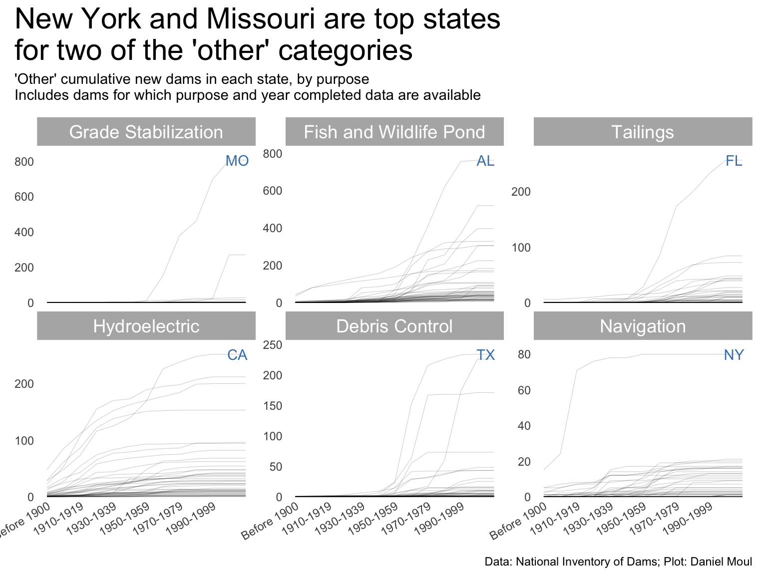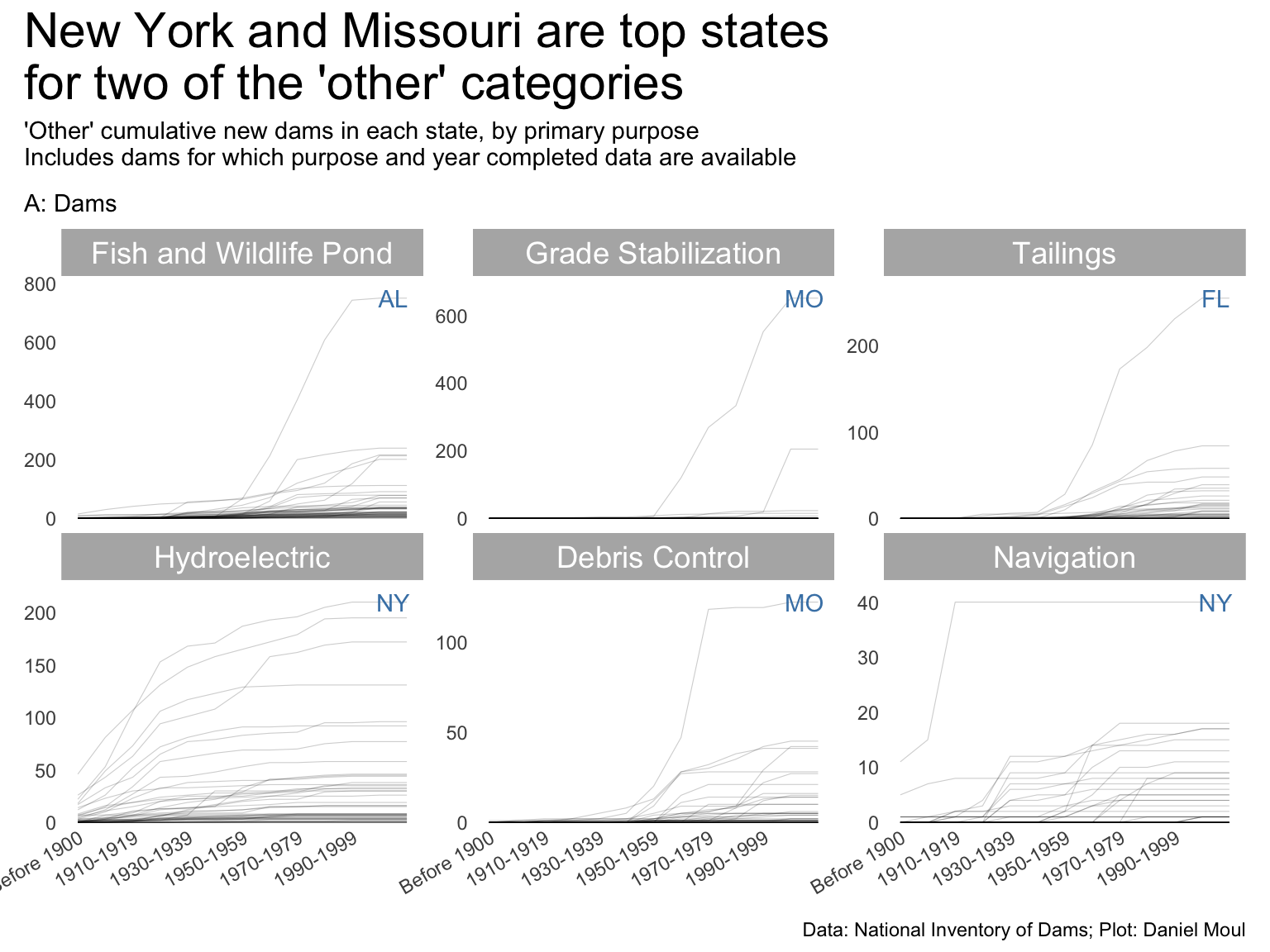 exclude_purposes <-c("Recreation", "Flood Risk Reduction", "Fire Protection, Stock,\nOr Small Fish Pond","Irrigation", "Water Supply")year_build_by_primary_purpose <- dams_no_geo |>left_join(dams_no_geo_all_purposes |>select(nidId, purpose_id),by =join_by(nidId)) |>filter(yearCompletedId !="Undetermined", purpose_id !="Other or not specified", purpose_id !="Other") |>filter(!purpose_id %in% exclude_purposes) |>select(nidId, primaryOwnerTypeId, primaryPurposeId, purpose_id, state, state_abb, state_region, nidStorage, yearCompleted, yearCompletedId) |>mutate(yearCompletedId =factor(yearCompletedId, levels = yearCompletedId_levels, ordered =TRUE)) |>count(yearCompletedId, purpose_id, state_abb) |>complete(yearCompletedId, purpose_id, state_abb,fill =list(n =0)) |>mutate(n_cum =cumsum(n),idx =row_number(),.by =c(purpose_id, state_abb)) |>mutate(purpose_id =fct_reorder(purpose_id, -n_cum, min))dta_highlight <- year_build_by_primary_purpose |>filter(yearCompletedId !="Undetermined", yearCompletedId =="Since 2000") |>slice_max(order_by = n_cum, n =1,by = purpose_id)p1 <- year_build_by_primary_purpose |>ggplot() +geom_line(aes(yearCompletedId, n_cum, group = state_abb),linewidth =0.2,alpha =0.2) +geom_text(data = dta_highlight,aes(yearCompletedId, n_cum, label = state_abb),nudge_x =0.5,color ="steelblue",show.legend =FALSE) +scale_x_discrete(breaks = yearCompletedId_breaks) +scale_y_continuous(expand =expansion(mult =c(0.01, 0.1))) +guides(color =guide_legend(override.aes =list(linewidth =3))) +expand_limits(y =0) +facet_wrap(~purpose_id, scales ="free_y") +theme(plot.title.position ="plot",legend.position ="top",axis.text.x =element_text(angle =30, hjust =1) ) +labs(# subtitle = "A: Dams",x =NULL,y =NULL )p1 +plot_annotation(title ="New York and Missouri are top states\nfor two of the 'other' categories",subtitle =glue("'Other' cumulative new dams in each state, by purpose","\nIncludes dams for which purpose and year completed data are available"),caption = my_caption )