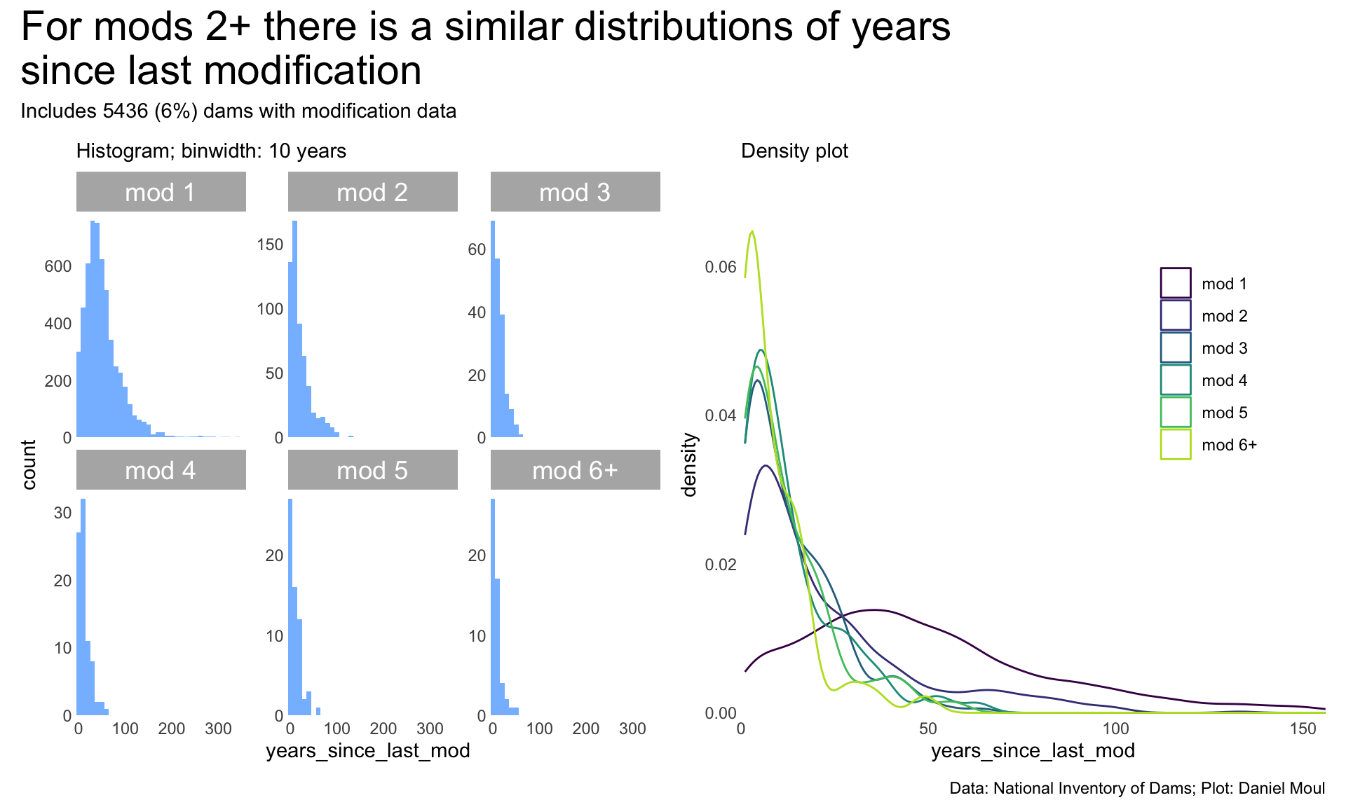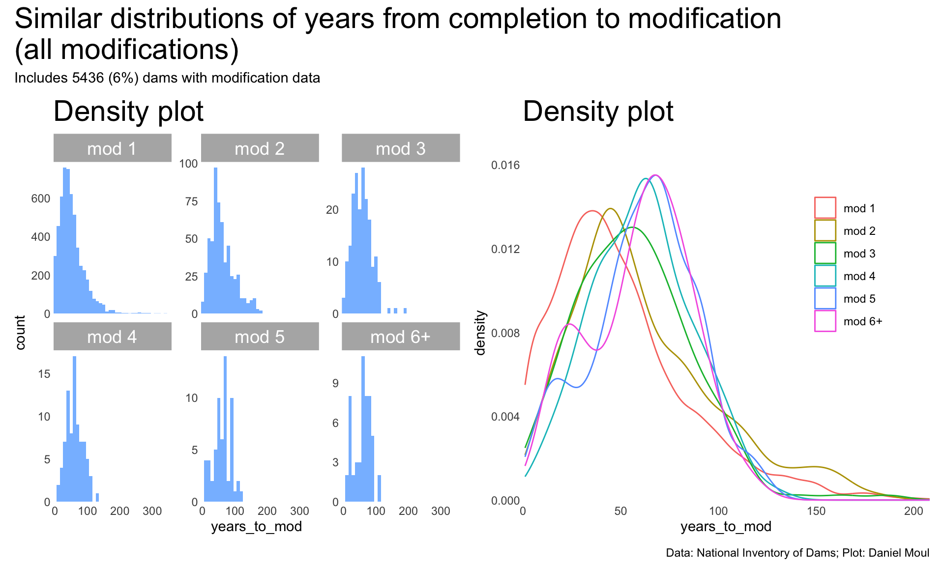 Even so, when we look at the distribution of years from completion to modification (Figure 6.26), the shapes are similar.