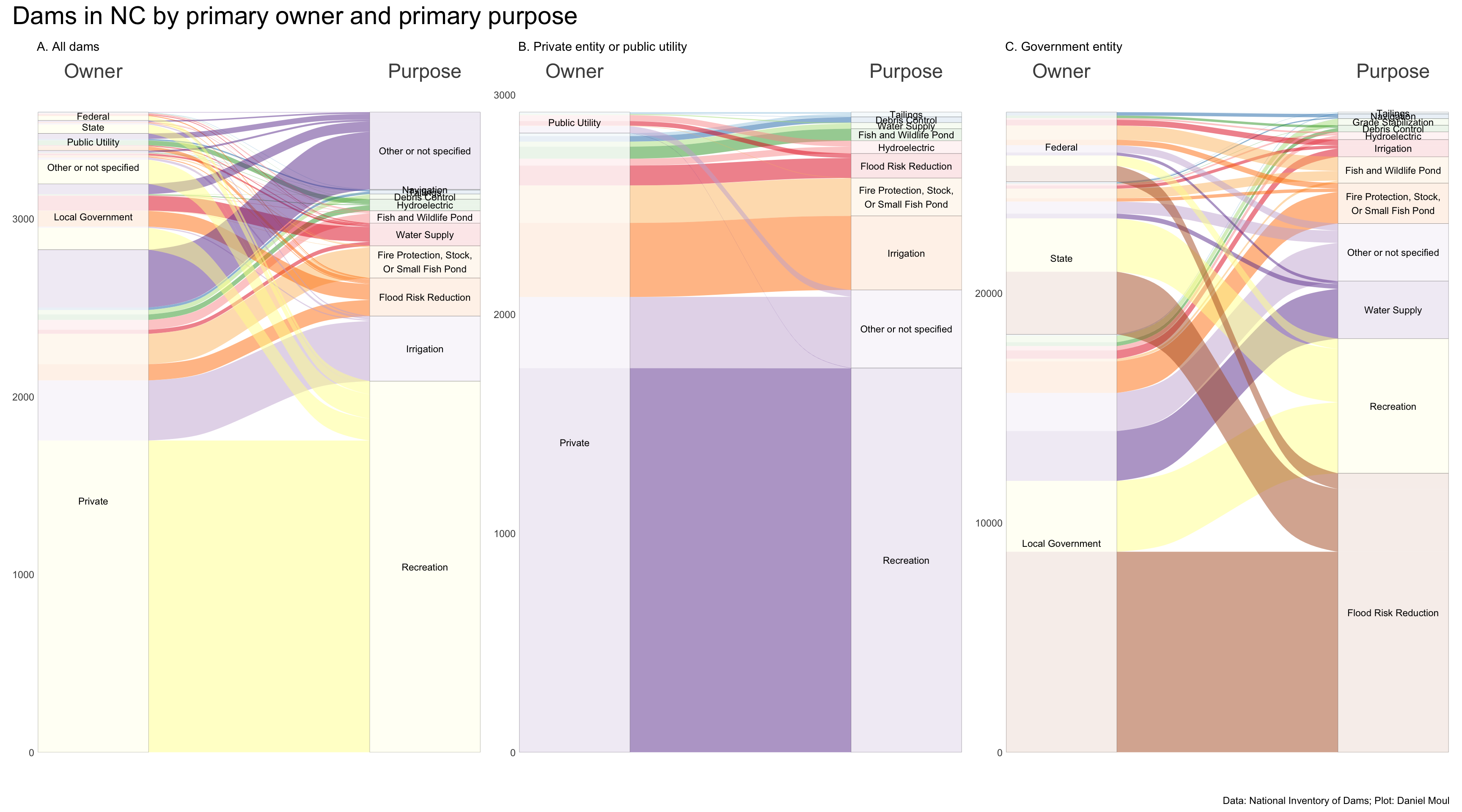 Nearly two thirds of the privately owned dams are for recreation (panel B).