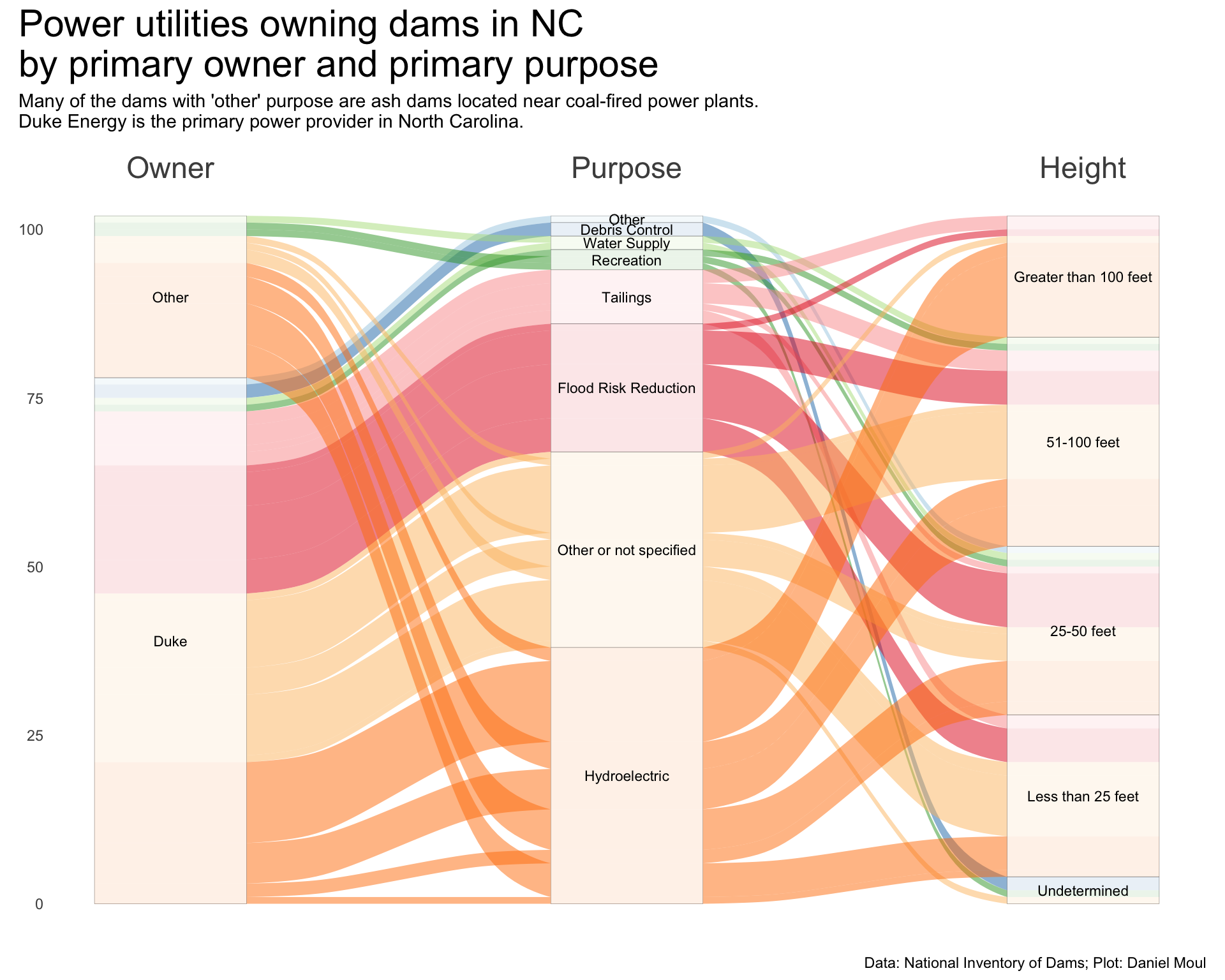 title = "Power utilities owning dams in NC \n by primary owner and primary purpose" ,