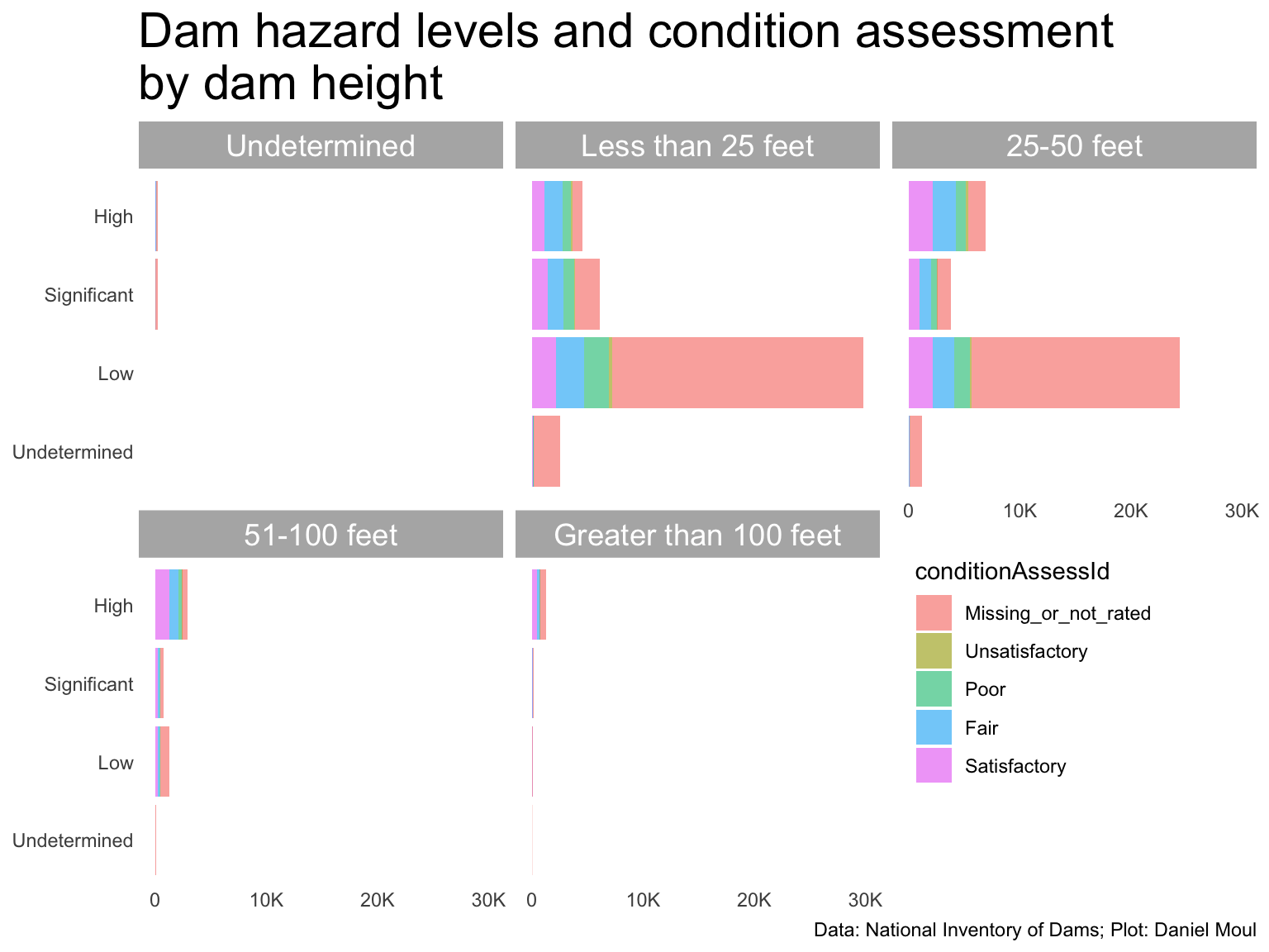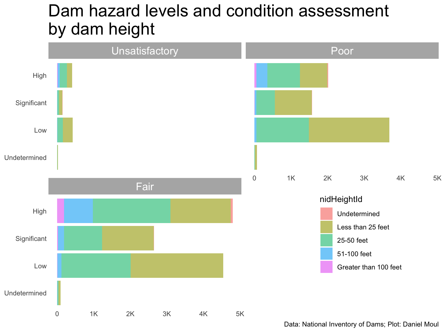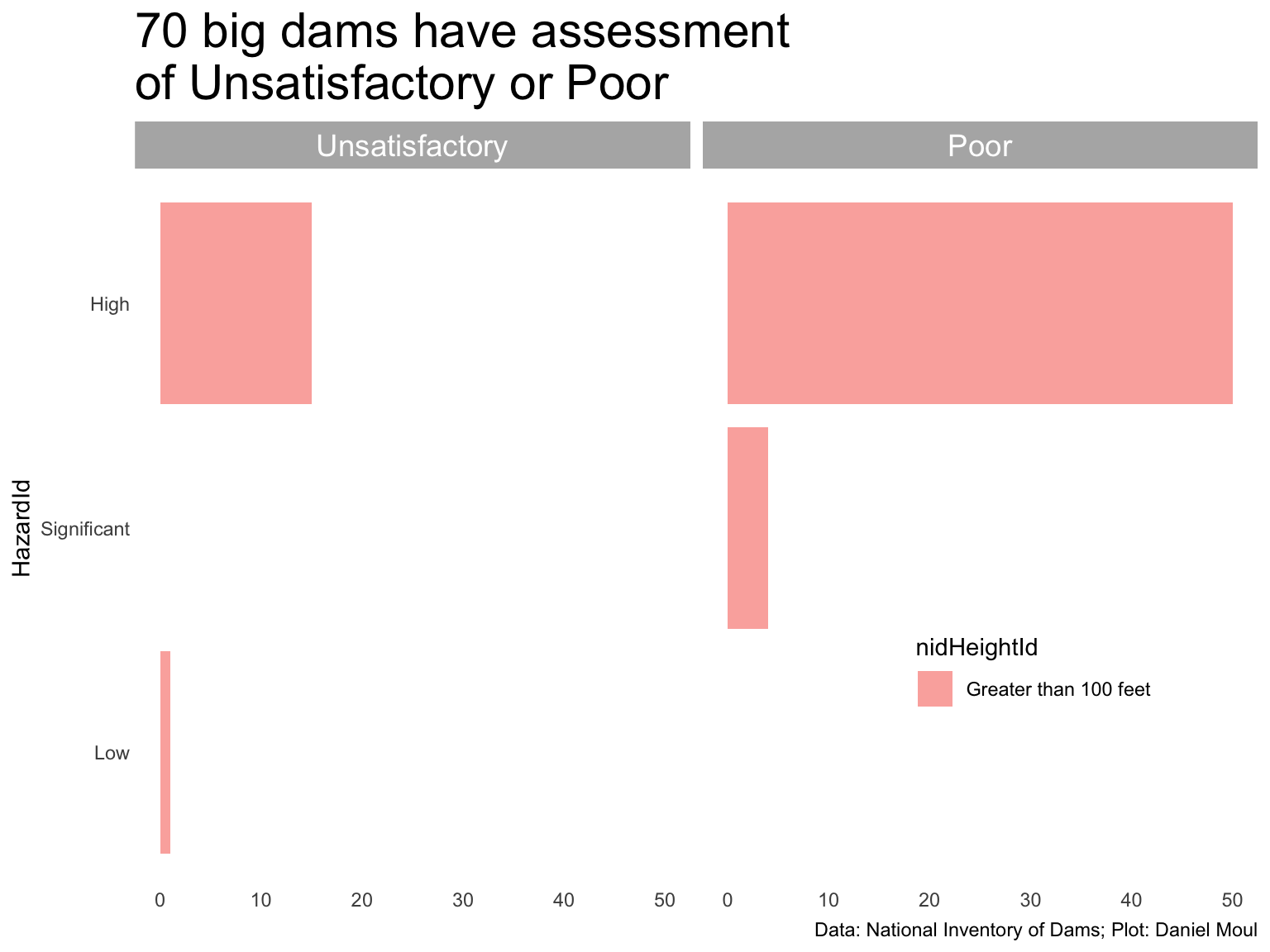 Most risky: over 100 ft, high hazard level, and unsatisfactory rating: